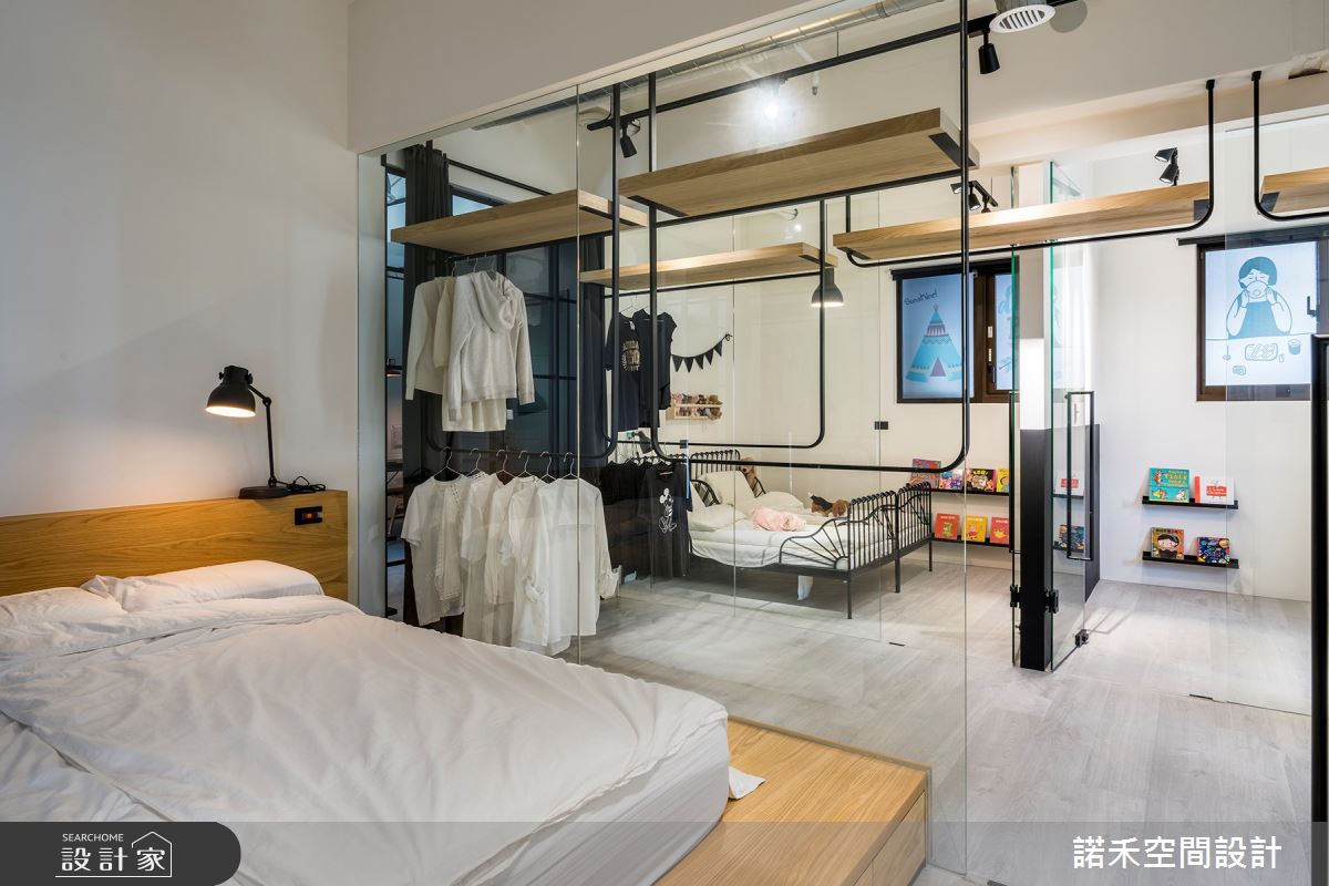 磚牆換成玻璃隔間後,三間寢室變得格外寬敞明亮,捨棄常見的系統衣櫃,改以懸吊式掛衣架並移到隔牆外側,不僅能讓寢室更完整地被利用,一排排吊掛在玻璃隔牆外側的衣物變成空間最獨特的設計,也讓挑選衣物變成家人之間的互動話題。吊掛式的衣櫃設計同時解決玻璃隔間的隱私問題,設計師也在內側做了拉簾,讓空間能隨時提升隱私性。