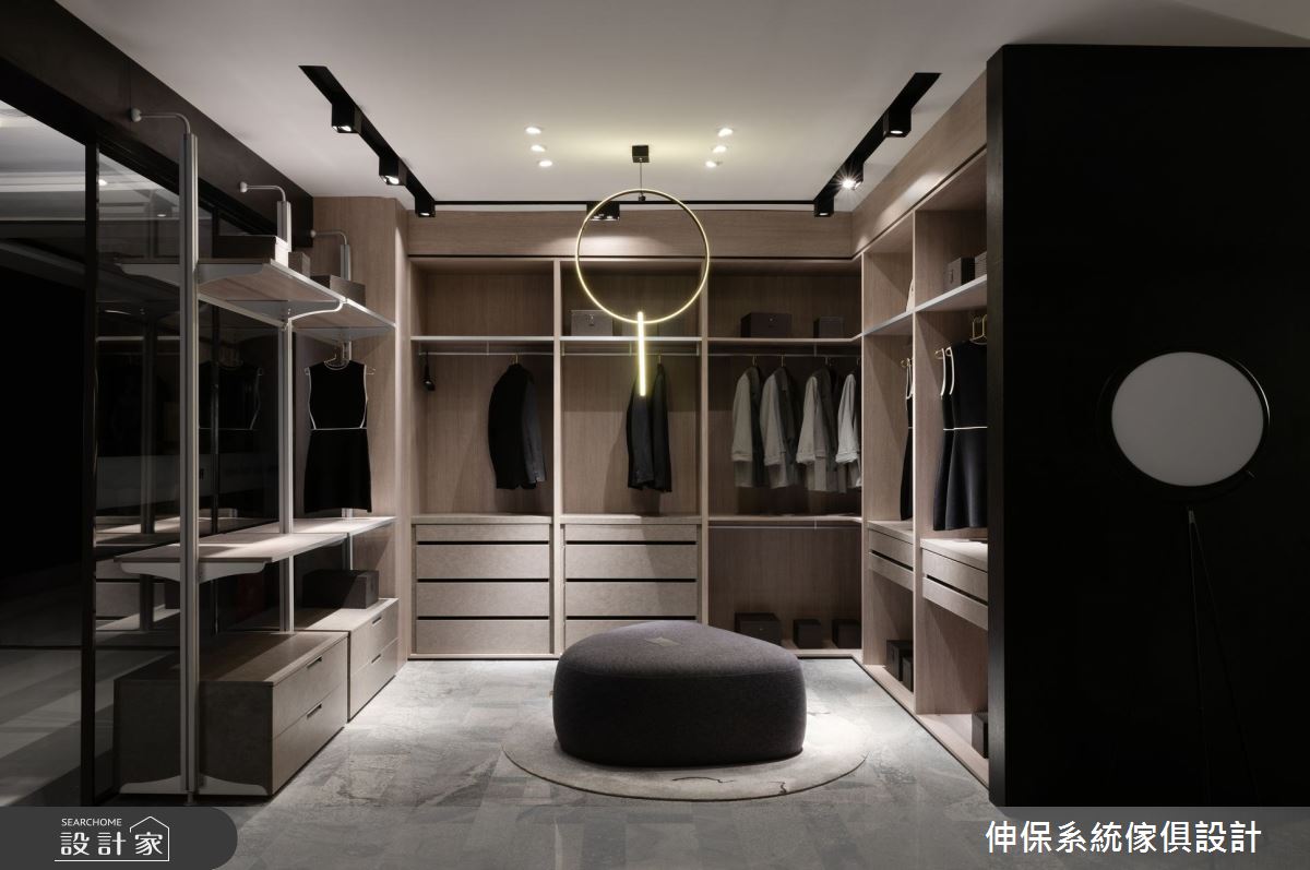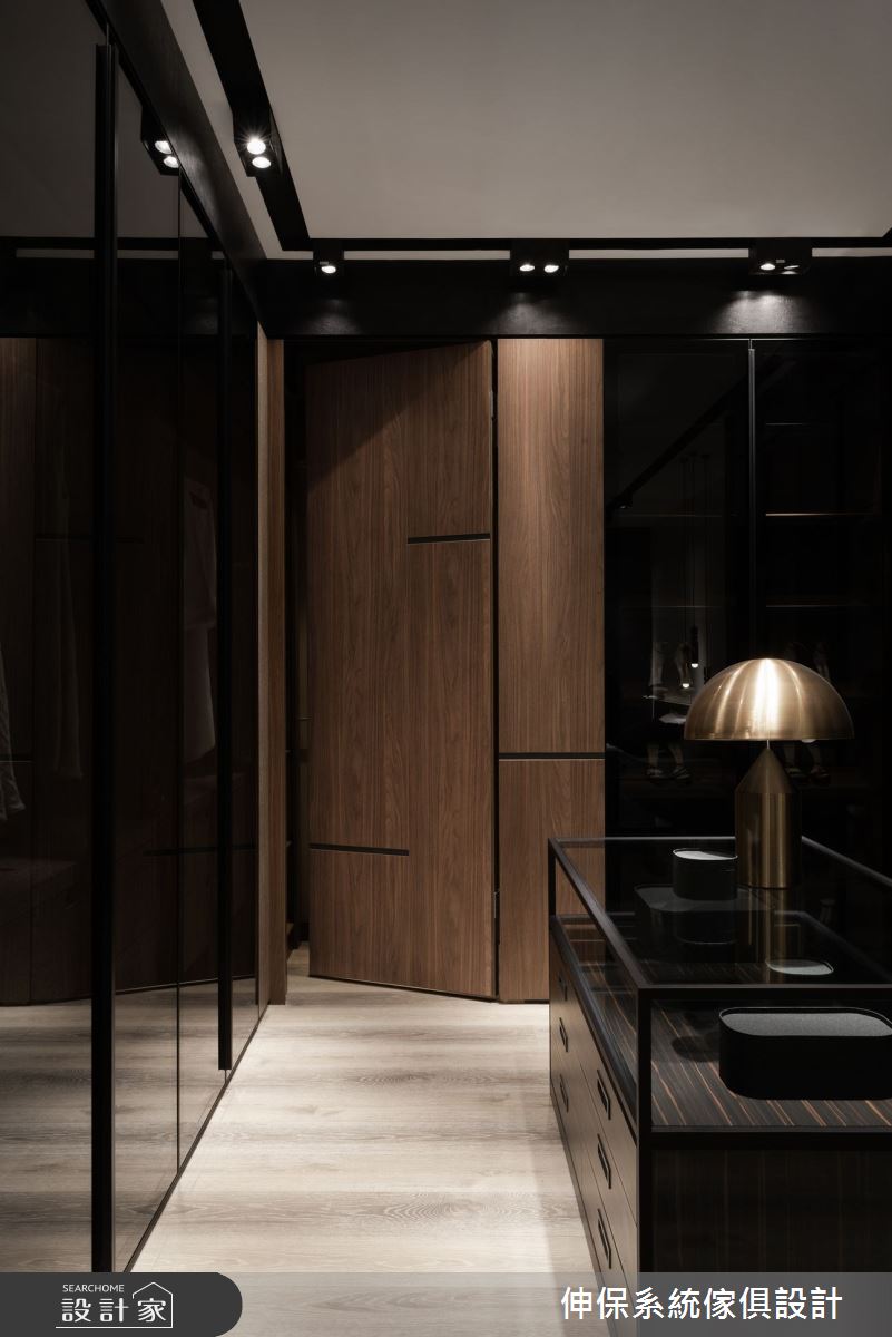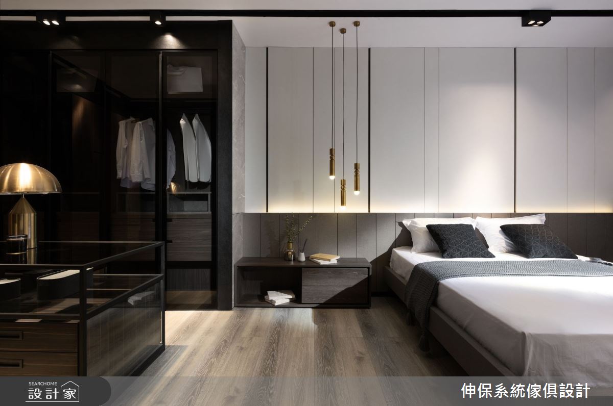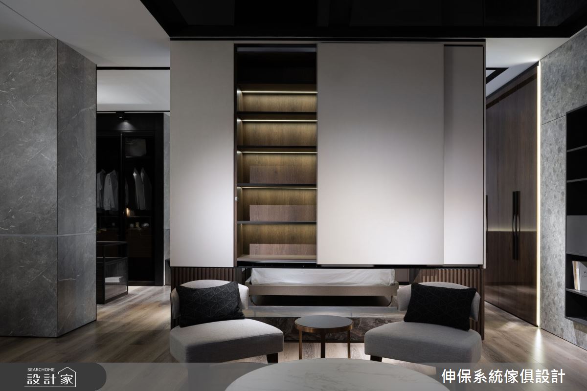 臥室與客廳僅一個系統櫃相隔,呈現系統櫃也能當作隔間的高效能,且在更衣室的牆面融合隱藏門設計,將板材的用途發揮得淋漓盡致,塑造舒適優雅的寢臥空間。