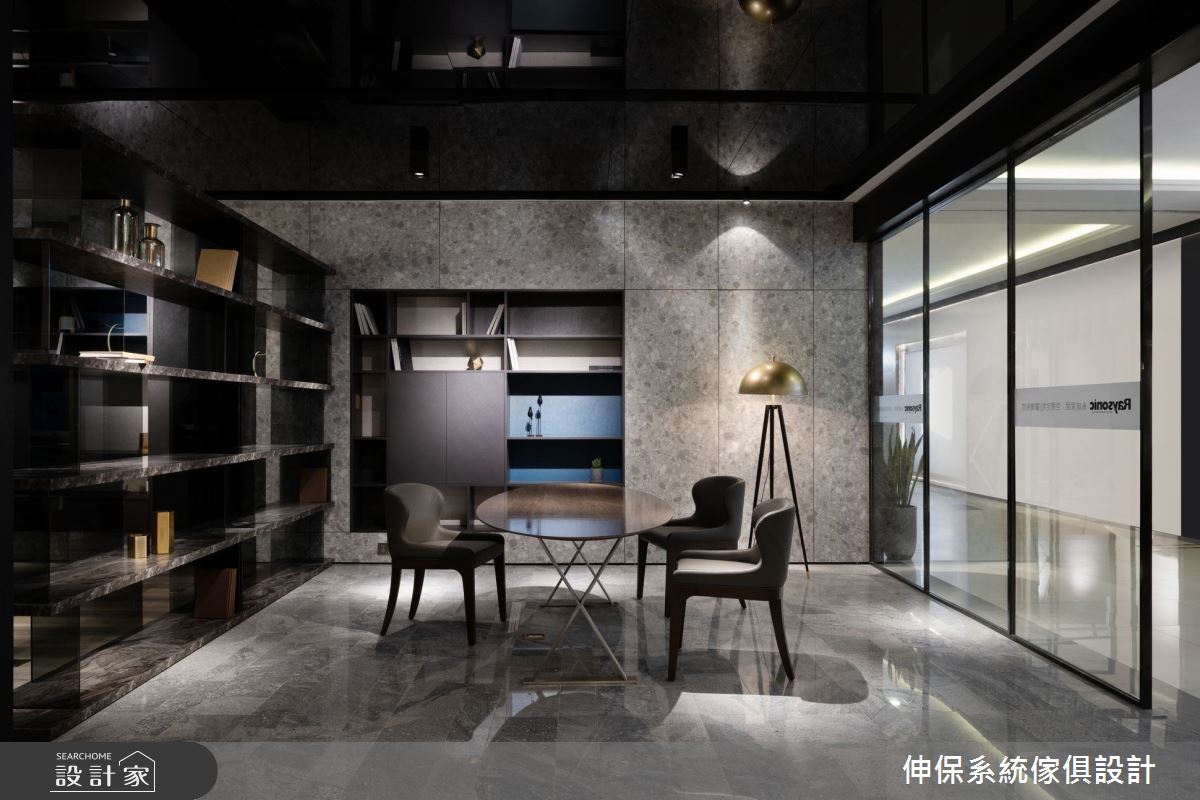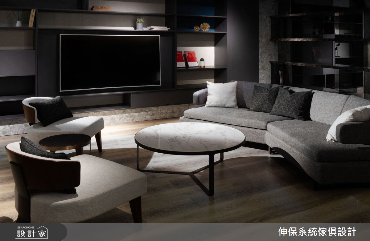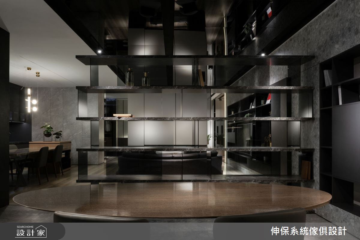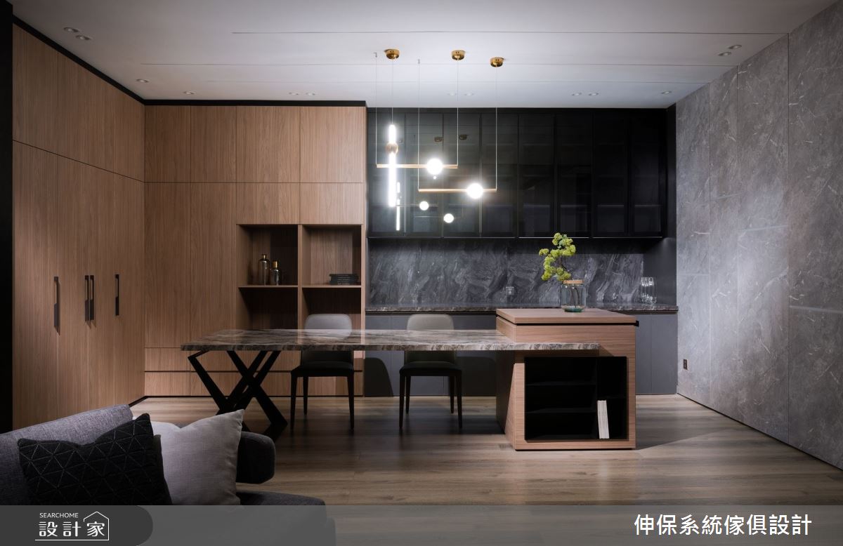 視線穿過餐廳的大型展示櫃,客廳利用圓弧形的家具佈置,平衡電視櫃的方正視覺,而色彩方面,也藉由茶几的金屬光澤,跳脫黑白灰的低彩度視覺,賦予低調奢華的空間質感。廚房依據機能的不同,分配櫃體的花色比例,而餐桌和吧檯也完美結合石材跟木質的調性,提升居家的機能和美感。