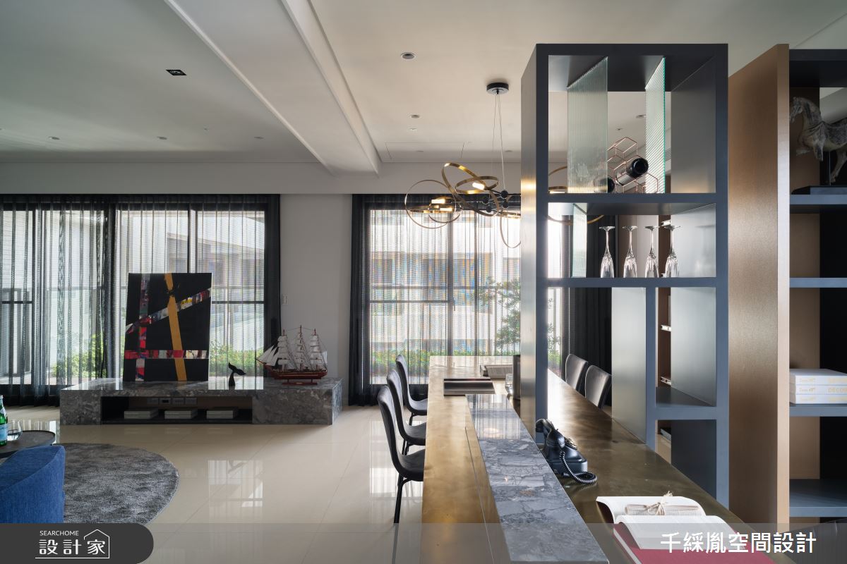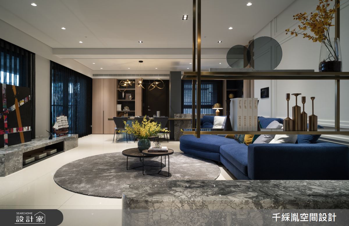 公領域採開放式設計,把握採光好、格局方正的優勢,搭配鏡面反射效果,創造通透寬敞的視野,給人氣派大方的第一印象,輔以玄關處的鍍金層架和石材設計,奢華卻又不失質感。寶藍色長型沙發作為視覺焦點,和餐廚區域的背牆相互呼應,為空間注入一股活力,同時刻畫深淺不一的層次感。更運用巧思將餐廳長桌延伸,藉由縷空展示架間隔出書桌,兼具凝聚情感及閱讀工作的機能,為彈性而豐富的設計語彙作出完美註解。