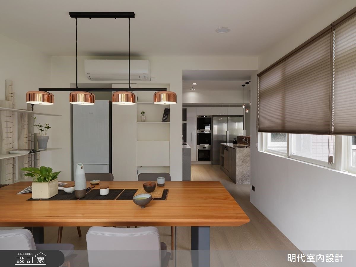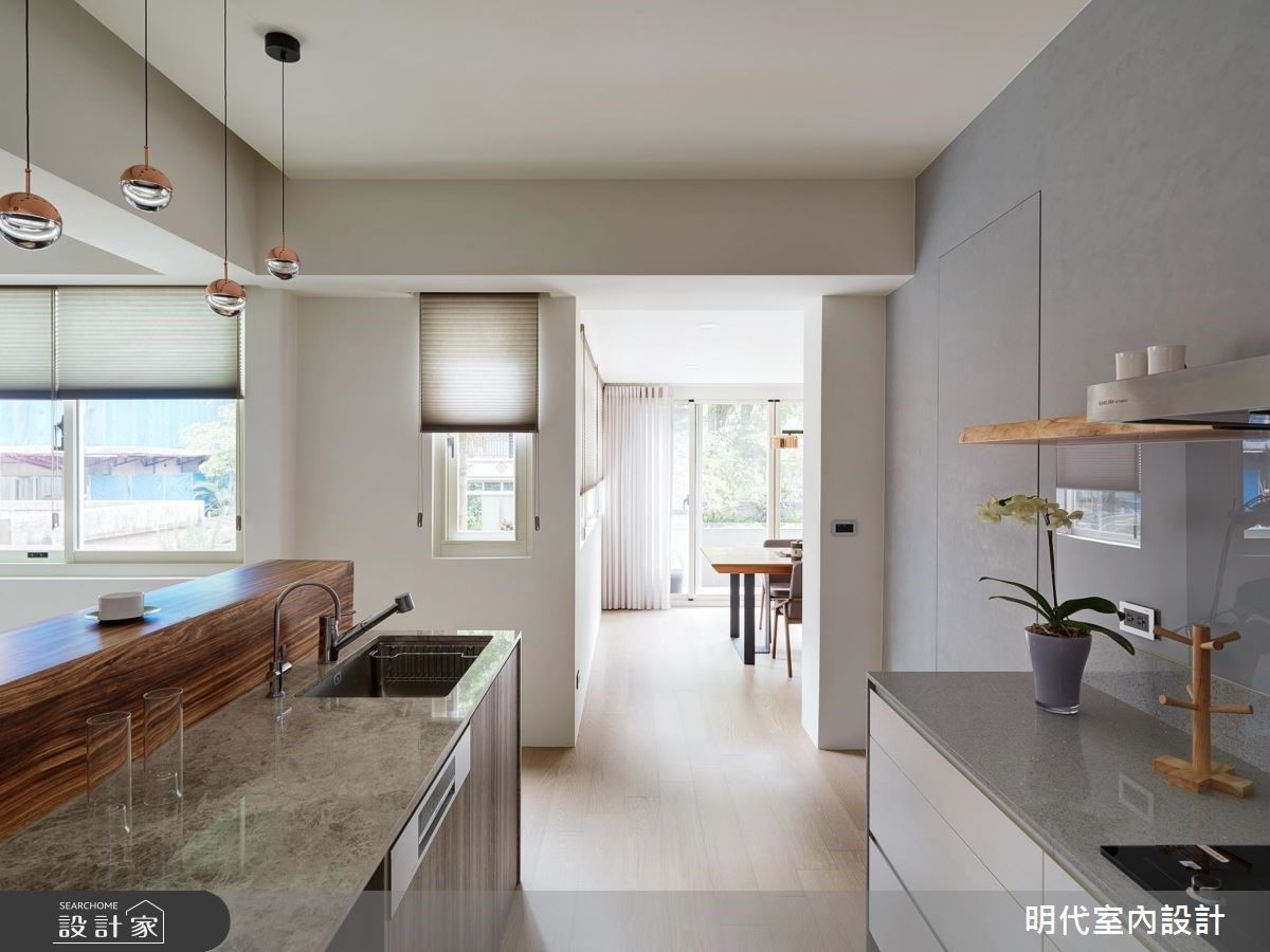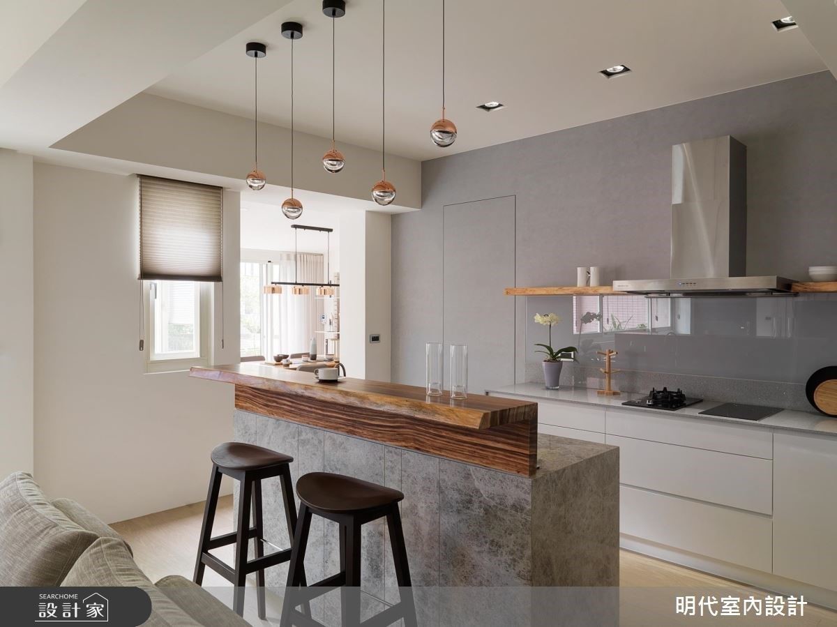 打開格局後,由外而內的引光入室,客餐廚形成開放通透的動線串聯,讓人與光都可以在家中更自由的穿梭。尤其,廚房從原本屋中最不起眼的地帶成為全家的軸心。對現代人而言,廚房已不再只是做菜料理的地方,更是可以帶動團聚期盼,凝聚家人情感的象徵。女主人是全職的家庭主婦,大而明亮的廚房,讓她能悠哉引導家人一起下廚,凝聚無法取代的親子情感交流。中島吧檯略為阻擋入門見灶的忌諱,上方高低錯落的燈具,活潑的畫面分割,營造入門的聚焦視覺。
