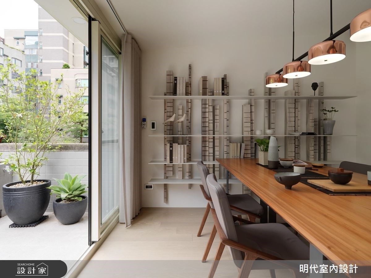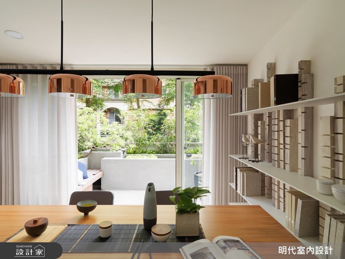 這間中古屋採光良好,還有一個大露台,可惜傳統格局不佳,露台僅與主臥室相連,再加上五房規劃,公領域無法分享自然光源,餐廚區被擠在兩門間臥室之間。明代設計團隊將不差的原始條件放大變好,拆除兩房隔間,餐區挪至露台前,明亮開闊的視野,將四季晴雨的自然變化盡收眼底,讓這裡除了有輕鬆用餐的氛圍,也成為一家四口閱讀,充實身心靈的好角落。牆面以錯落的木條排列造型,架上可以調整的鐵件層板,隨意的擺放書籍或收藏,在天光綠意中悠閒沉浸書香。