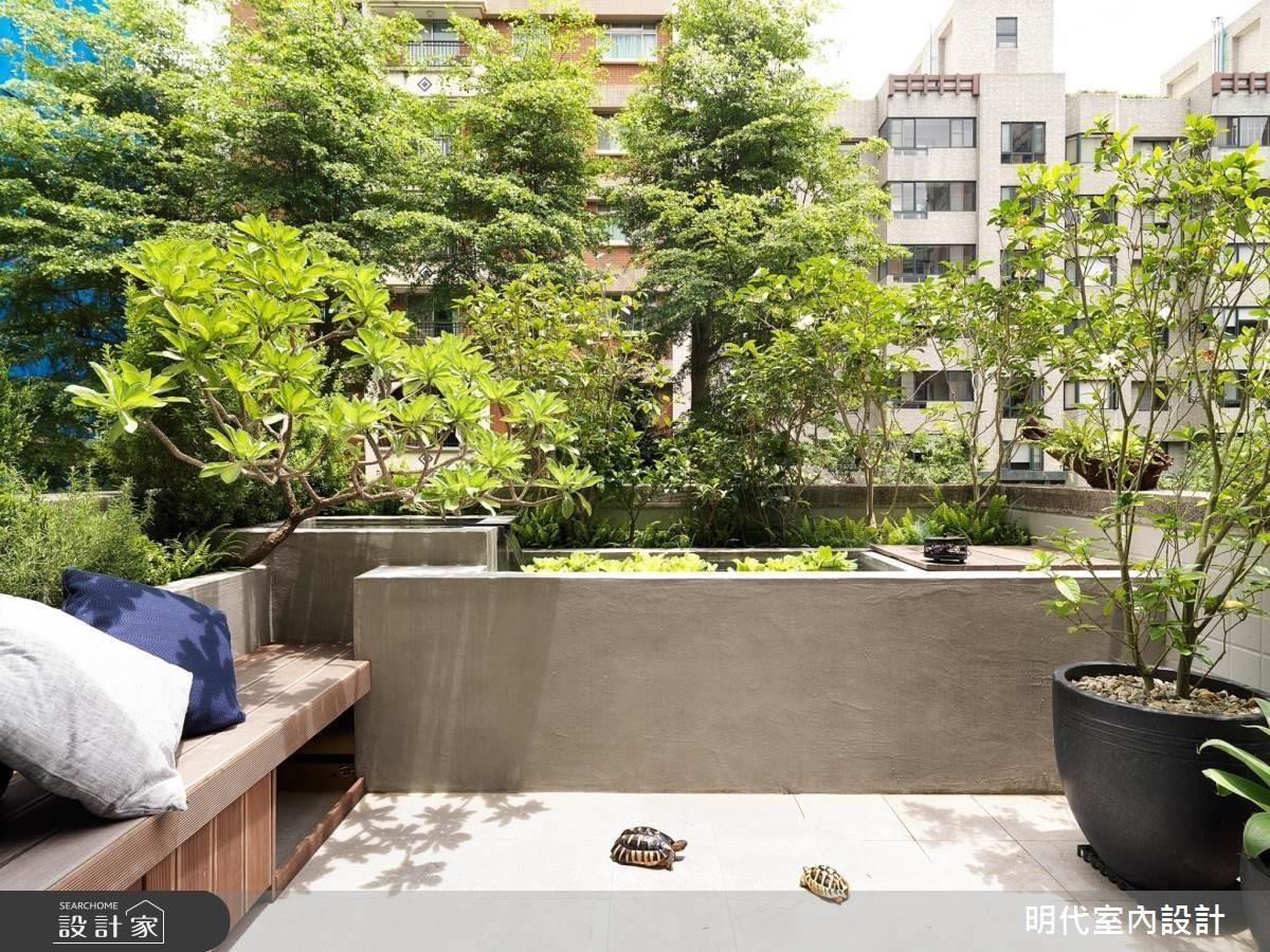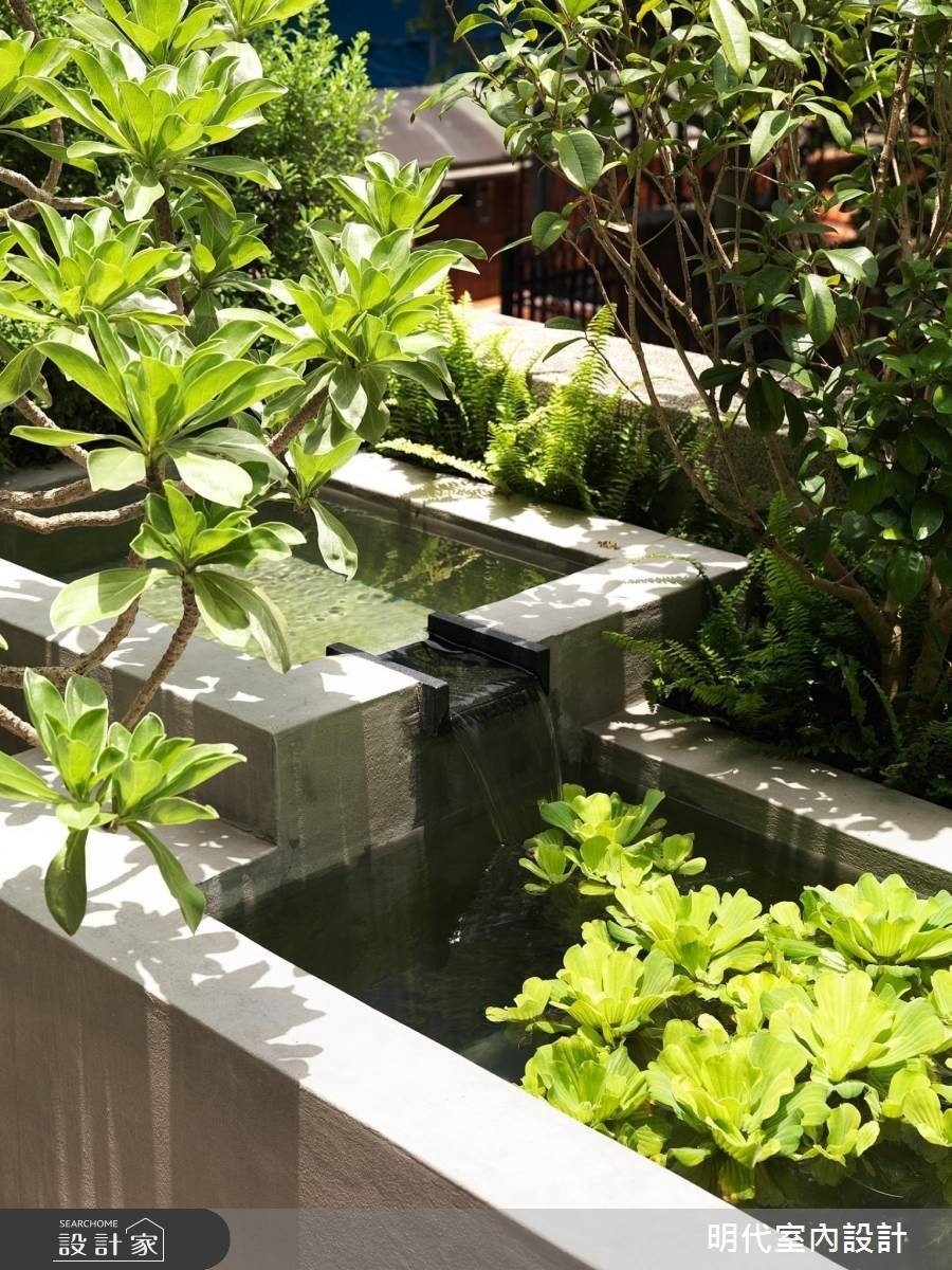 戶外的大露台,在明代設計團隊的改頭換面下,滿眼清新的植栽綠意,高低錯落的流水平台,潺潺低吟的水聲,簡樸而有禪意,成為都市裡的一小片世外桃源,更是一家四口與兩隻寵物陸龜互動的空間。看著陸龜緩慢爬行的步伐,在植物與日光的投影變化中,再煩擾的心情也能沉靜下來。
