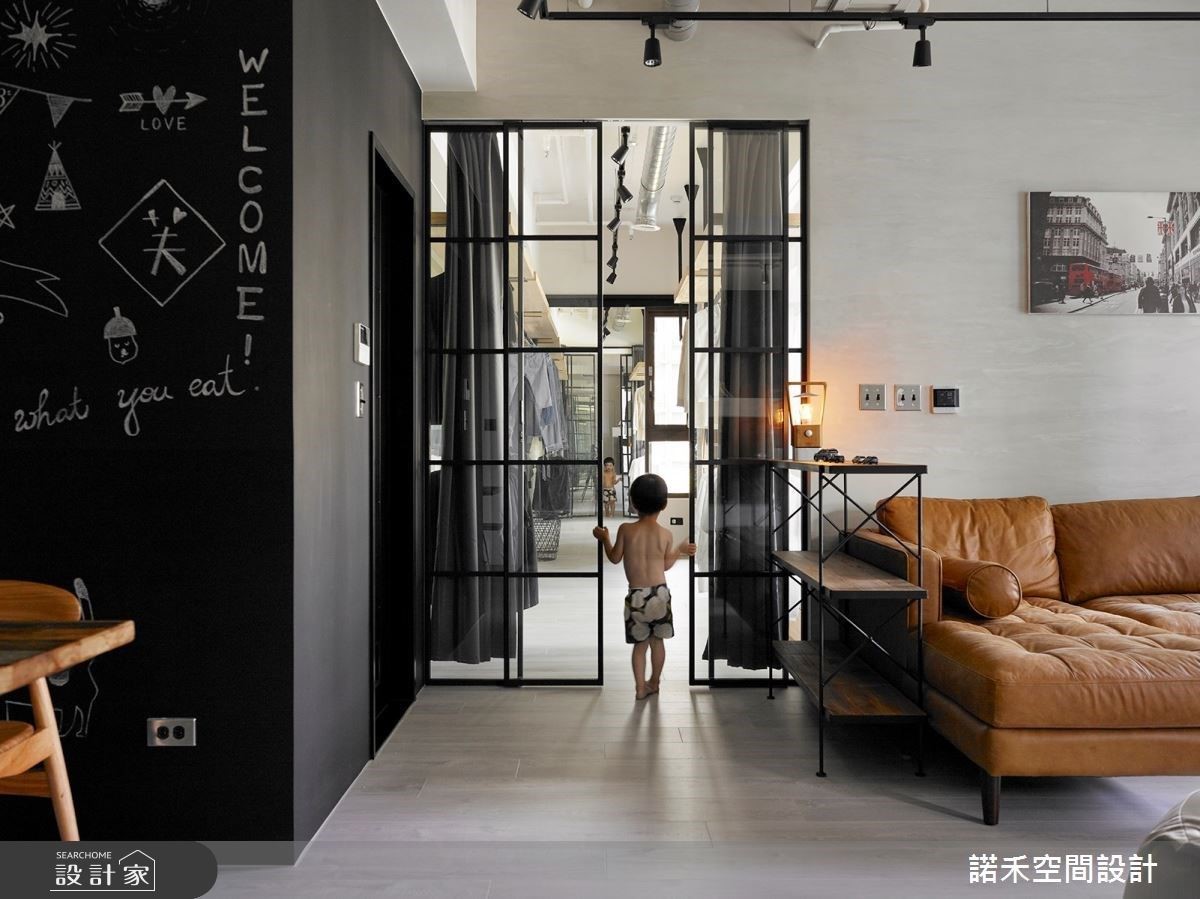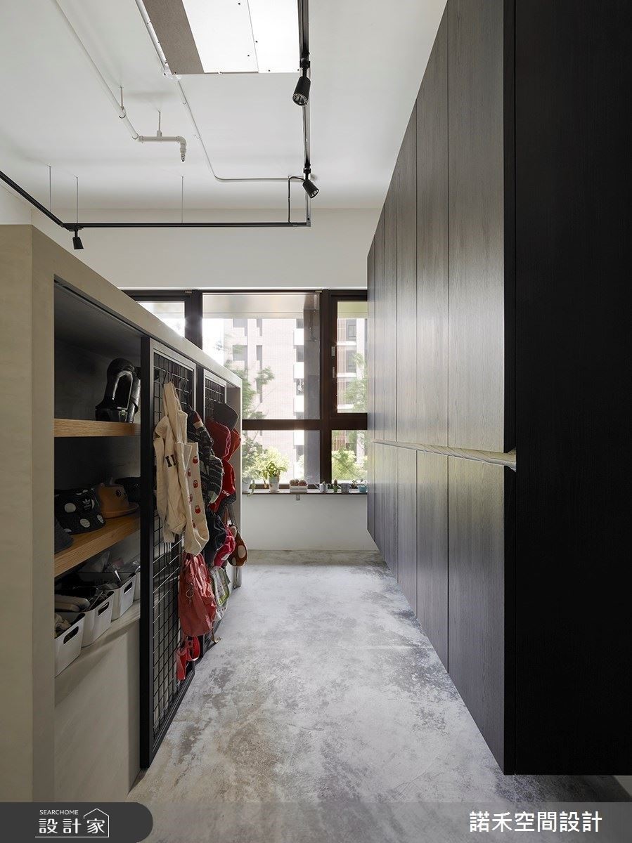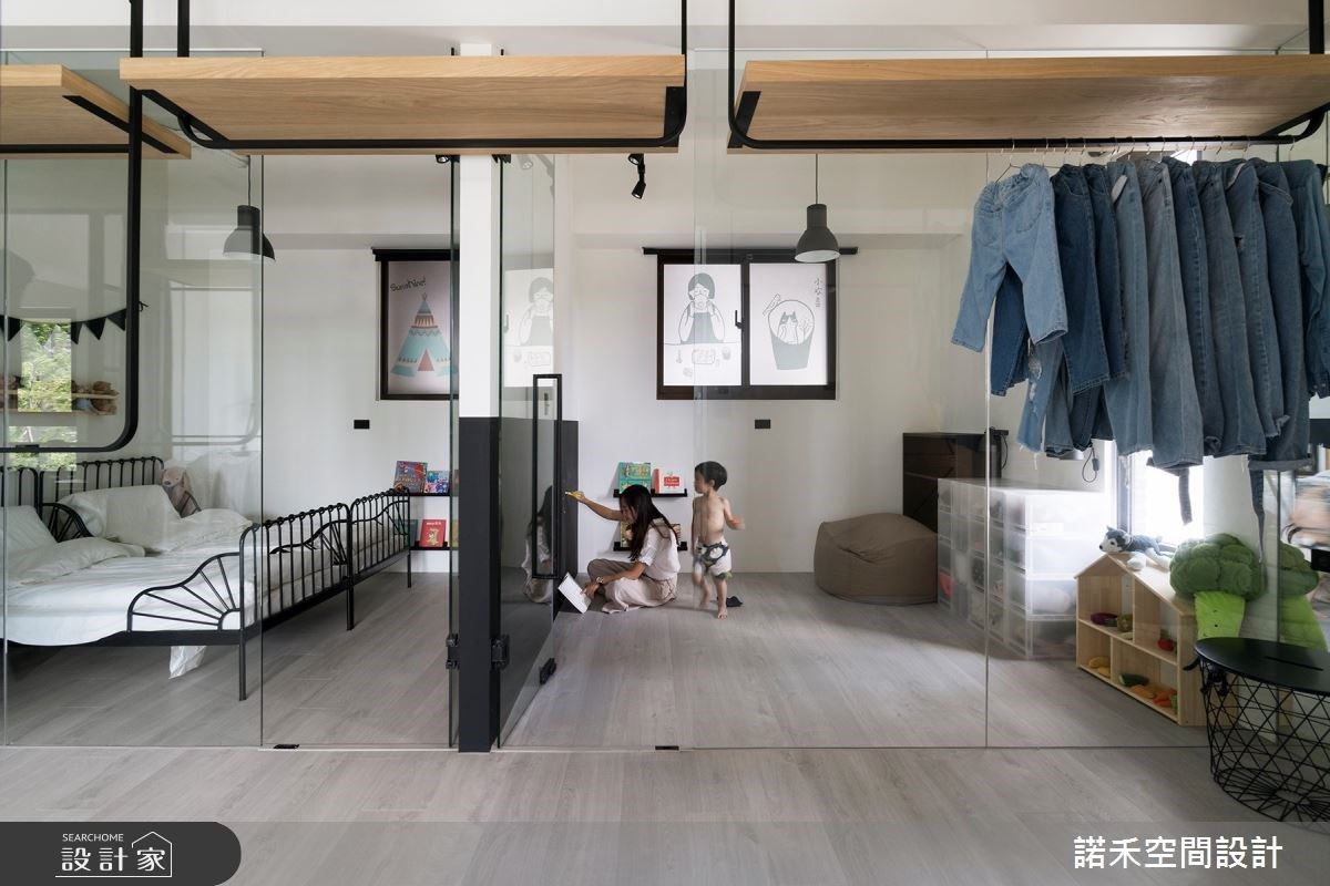 原本與長輩同住,一家四口共擠一房,女主人非常期待在新家能有更好的互動,一兒一女也能有屬於自己的空間。有著慧心巧手,十分伶俐的全職媽媽,對收納整理很有想法,也把「家是一起使用,必須共同維護」的觀念影響孩子,因此,設計師大膽的將私領域原有的隔間牆全部改換清亮通透的玻璃,讓採光得以無礙的由主臥進入小孩房與遊戲區;更將陰暗廊道變大,底端鋪設鏡面,虛實莫辨,映照光景,讓廊道顯得更為寬闊而悠長,兩側以整齊的鐵件加層板打造開放式的衣物吊掛收納,天花則以軌道燈向下投射,在看似一定高度的工整設計下,燈具卻能隨心所欲轉換角度,營造自己想要的光影氛圍。在家人良好的生活習慣與共同合力維護下,時時都能維持清爽乾淨的面貌。