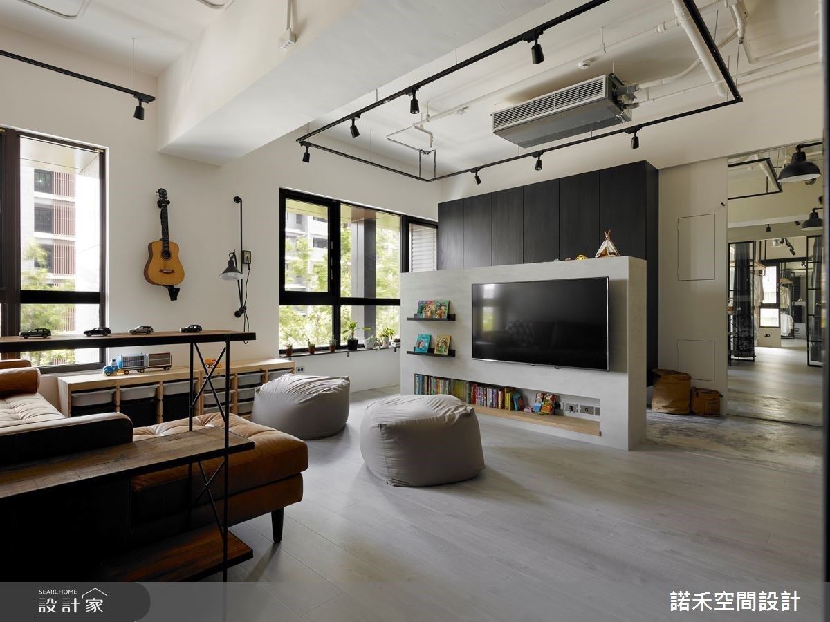 進門的黑色量體,是全家收納最完備的區塊。因應一家人進門就會卸下所有髒亂衣物及配件的習性,雙面可用的電視牆,後方設計為雜物收納區,鐵件格狀門片還能作為背包吊架,刻意的半矮高度,則是讓窗面採光得以穿透,在客廳的視覺不受阻擋。臨窗下方也擺放系統矮櫃,分類裝籃,整齊有序。