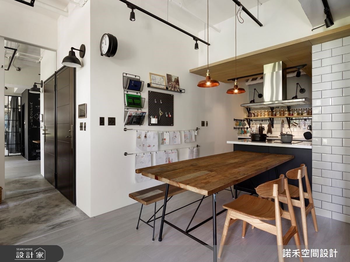 為了讓一家人有更好的互動,設計師拆除了原有餐廚區牆面,打開封閉格局,更將烹飪爐火轉向正對餐桌方向,女主人隨時可以和在客廳或餐廳的家人聊天,有一手好廚藝的她,也常帶著小朋友一起揉麵糰,享受自己動手做的美味。一旁的黑板漆牆,更是留下生活裡的點點滴滴。
