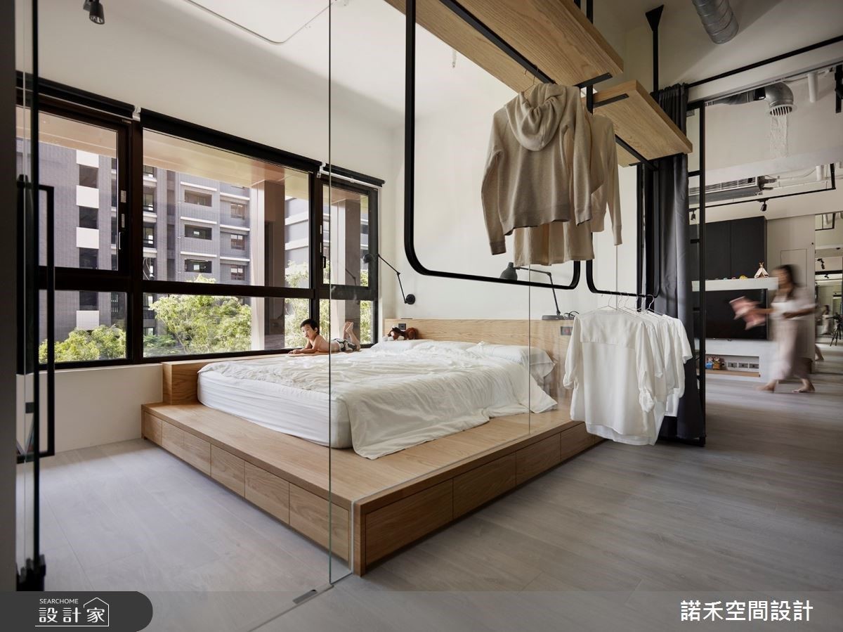 主臥床架低卻延伸出平台,小朋友可以或坐或躺,聽爸爸媽媽說著床邊故事,享受溫馨親子時光;平台兩側則是拉抽的隱形收納。兩個小孩年紀還小相差不大,暫時同睡一房,等年齡稍大後再做彈性調整,反而是遊戲區的需求目前相形重要,空閒時,女主人就在黑板漆牆上和小朋友一起寫字畫畫,陪著他們學習與成長。