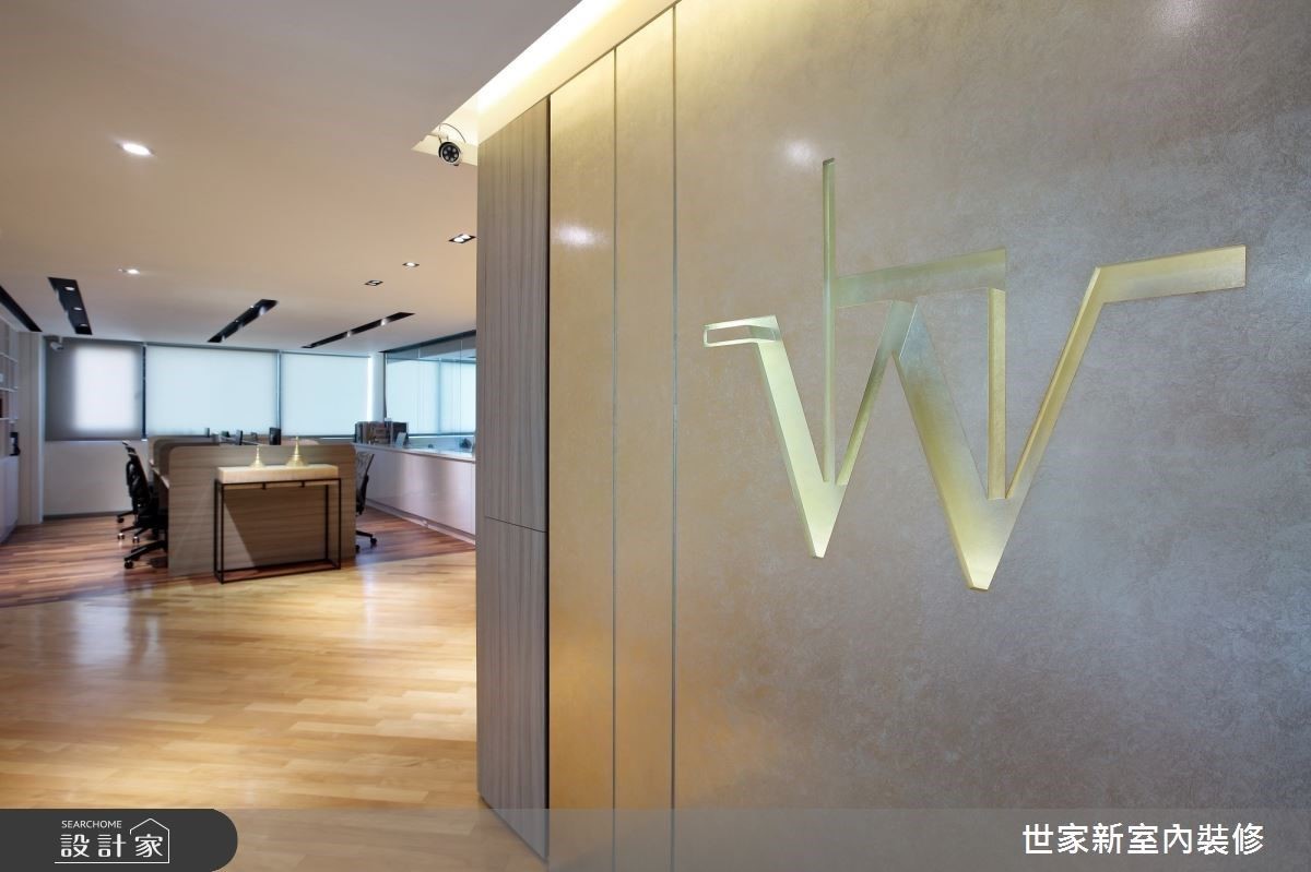 玄關以一面大牆呈現企業商標的氣勢,白色烤漆打底,細貼銀箔,藉燈光反射細膩的層次,隱隱閃動華麗的光澤;再鏤空以 W、N、H 為組字的商標,其中穿插陽刻,憑添變化的趣味,再以嵌燈內蘊光華。牆體轉折處則結合鞋櫃,隱藏機能。