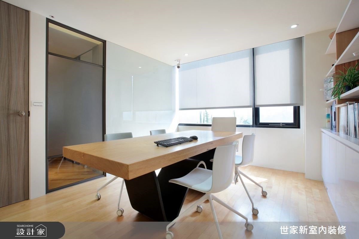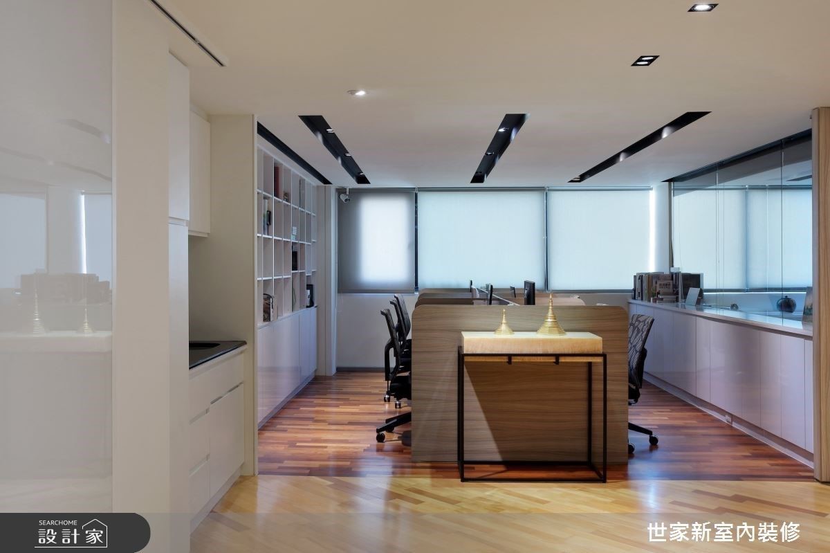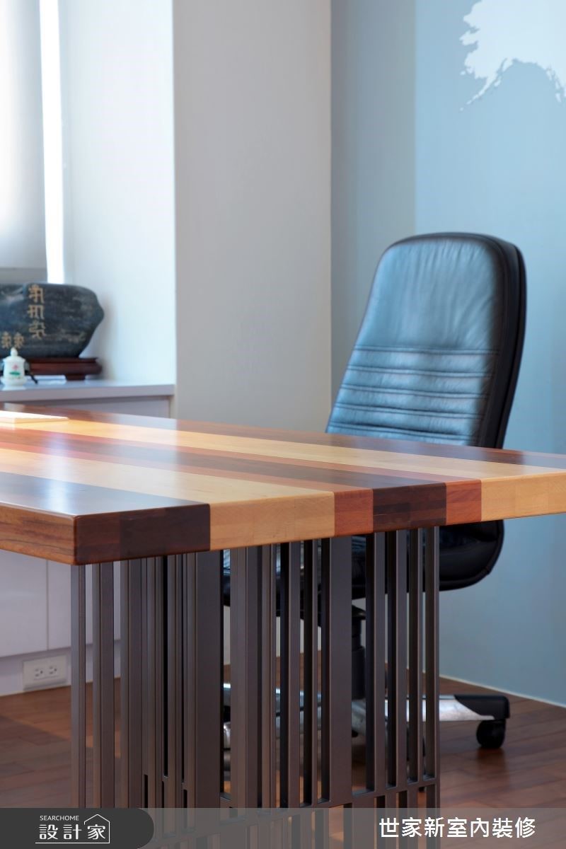 辦公室以純白淨色迎接窗光,打亮簡約風,讓工作思緒得以沉澱。而家具軟件是唯一的跳色,主管室的辦公桌拼貼柚木、花梨木、紫檀和楓木,以色澤律動表現材質特色;會議桌則以蘇利南金絲檀木,結合W曲線為桌腳,置入商標語彙。