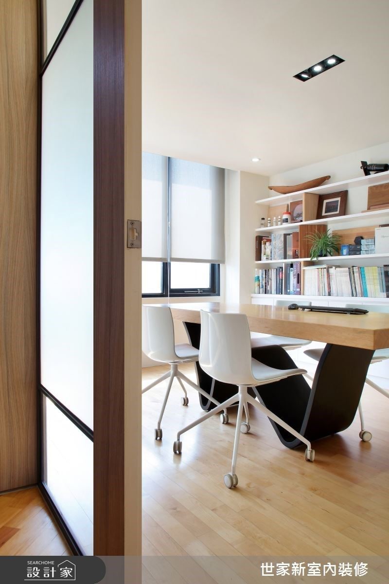 當藝廊橫跨整區,四周環以不同場域時,要把零碎的空間拉出完整又通透的視感,即以半隱半顯的手法,將底端兩側以系統板材打造為對稱的實牆,並藉切割線條融入隱形門,右側則呼應玻璃滑門呈現虛實錯落之美,並援引自然光線。