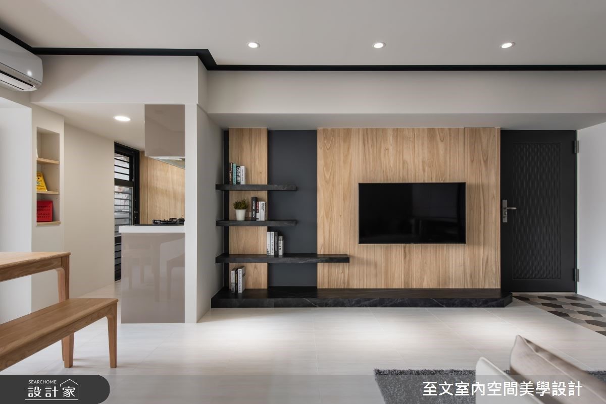 雖然沒有過多華麗的裝潢,卻利用線條在空間留下有意思的軌跡,沙發背牆的直紋其實隱藏了通往主臥與次臥的入口,而環繞客廳上方的粗黑框為平凡的白色天花板勾勒出帶有層次感的輪廓,連迷你儲藏室櫃門的中線都要與書桌齊高,在簡單俐落的空間裡,創造出與眾不同的小趣味。