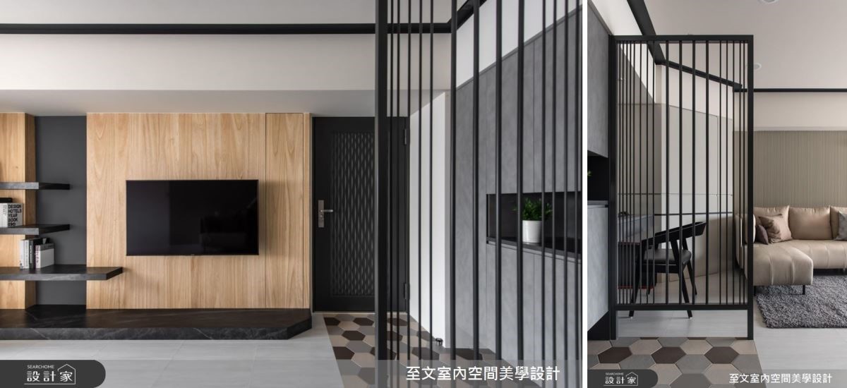 21 坪的空間有限,於是至文室內裝修團隊在公共領域採取開放式設計,雖然額外隔出玄關,但以粗細不一、間距各異的鐵件組合,讓視覺無礙穿越的同時,又能區隔使用空間。仿石材與木質建材的交互運用,從客廳延伸至餐廳、廚房,剛硬的冷調與木材的溫潤形成對比,中和了空間調性。