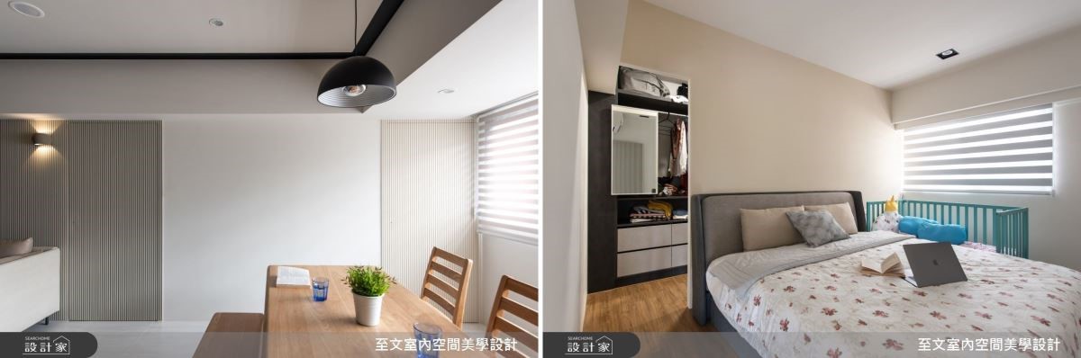 線條的運用不止為空間增添活潑感,也順勢隱藏了私領域的入口。沙發背牆的細直紋牆面給人相當純淨的感覺,卻又帶有立體感,不會過於無聊,一路延伸到餐廳,主臥與次臥的入口就分別在沙發後與靠窗處(左圖)。採光也很優的主臥室還有空間做出更衣室,粉嫩的色調與公共空間的冷調灰有所區別,為了迎接新生命的到來,連床頭都是圓角處理,很是窩心(右圖)。
