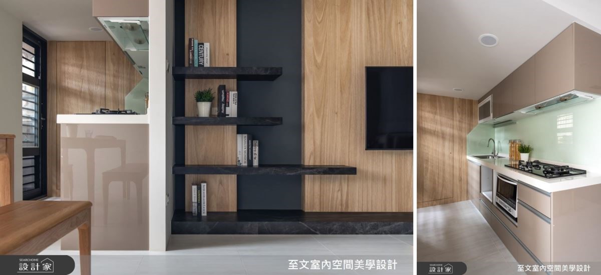 有人說最好的收納就是「斷捨離」,本案中並沒有滿滿滿的收納,反而將空間讓出來,讓居住者喘口氣。客廳電視牆的開放式層架雖然厚實,卻不會沉重(左圖),一牆之隔的開放式廚房採用結晶鋼烤與木皮、烤漆玻璃的組合,也展現另一種輕盈(右圖)。
