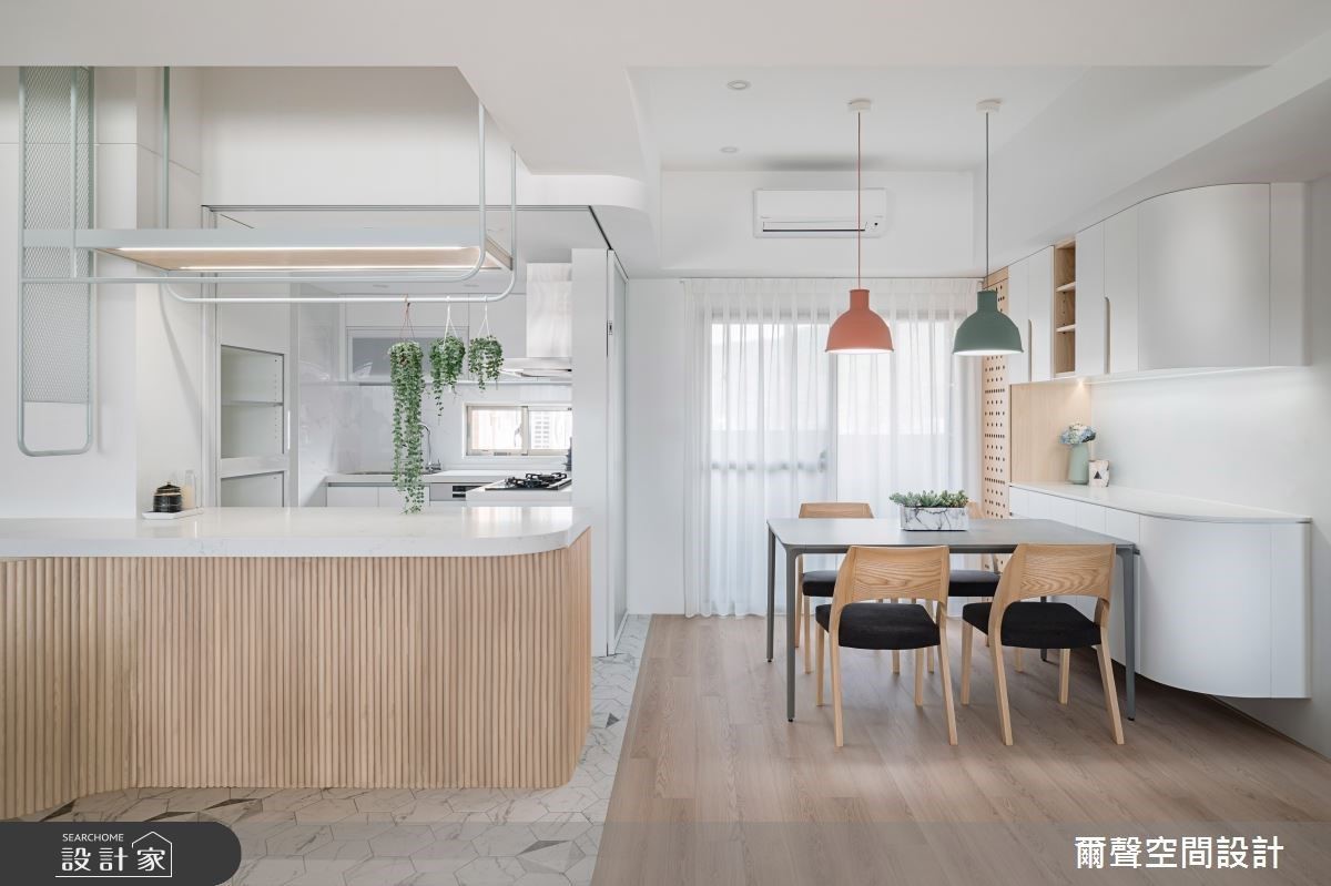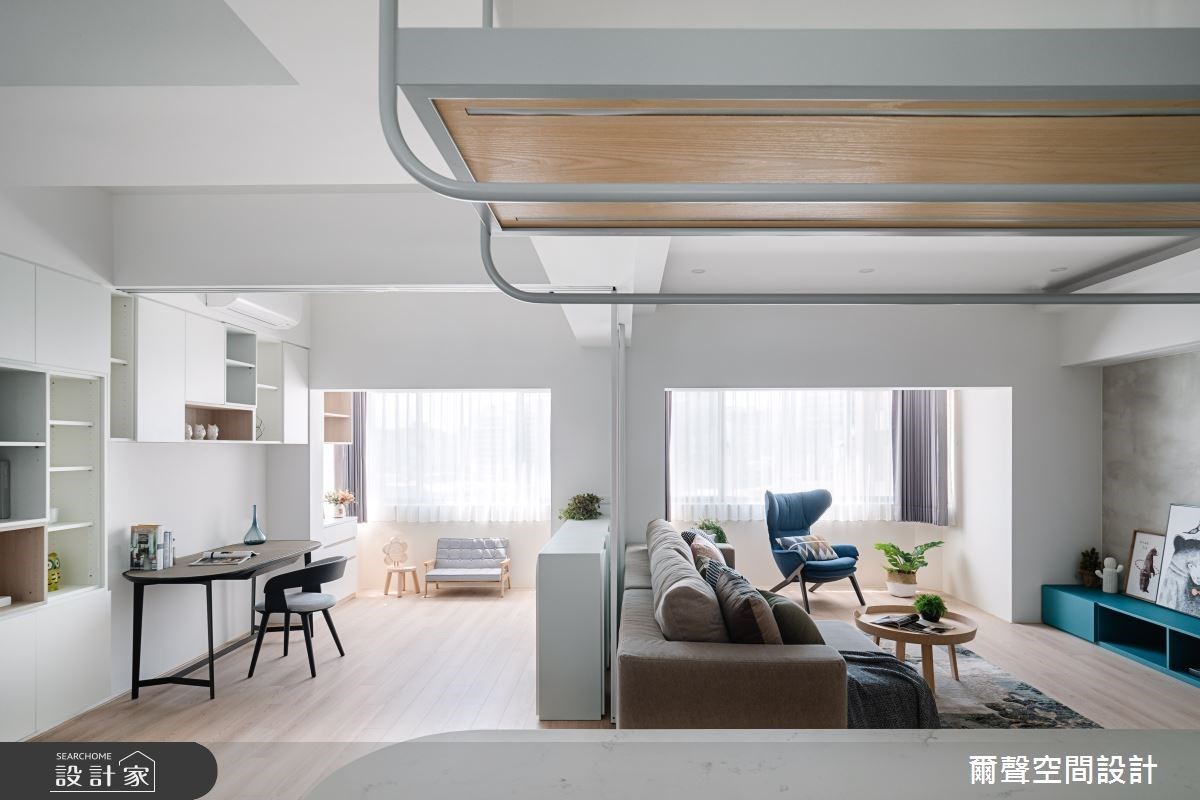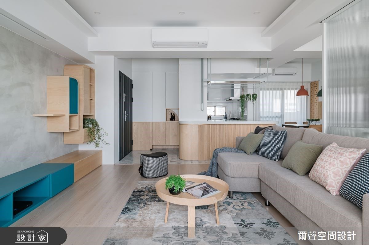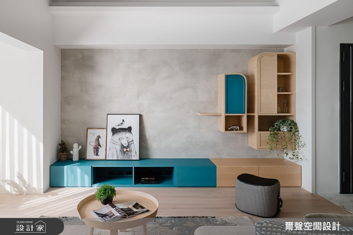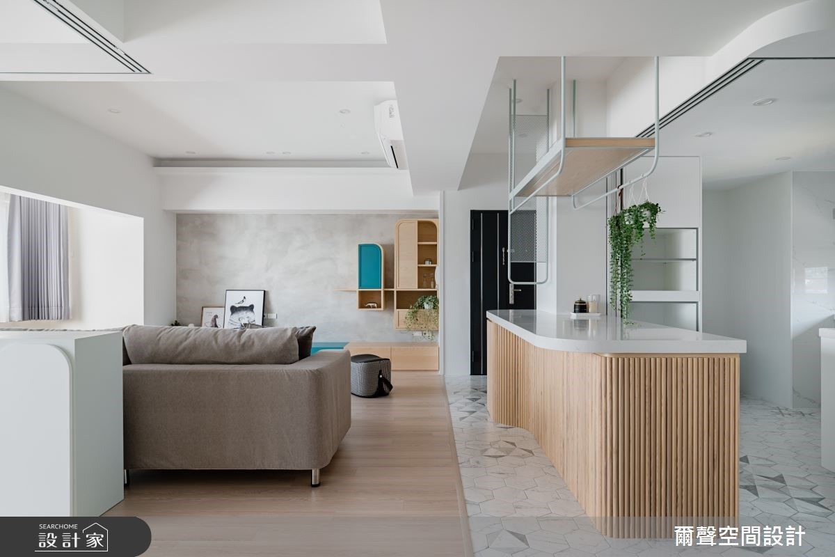 映襯著好採光,整體以輕盈的白與木色為基底,讓空間更顯清透與寬敞。女主人希望在簡潔中不失設計感,因此玄關以地坪花磚鋪墊,並延伸至廚房,適度跳色又好清理;灰色電視牆則增添優雅的藍搭配淺木色,讓地面的影音櫃與牆面略帶圓弧角度的吊櫃,呈現活潑吸睛的別致造型設計。
