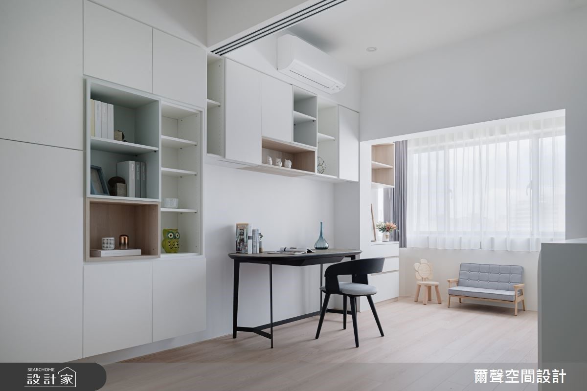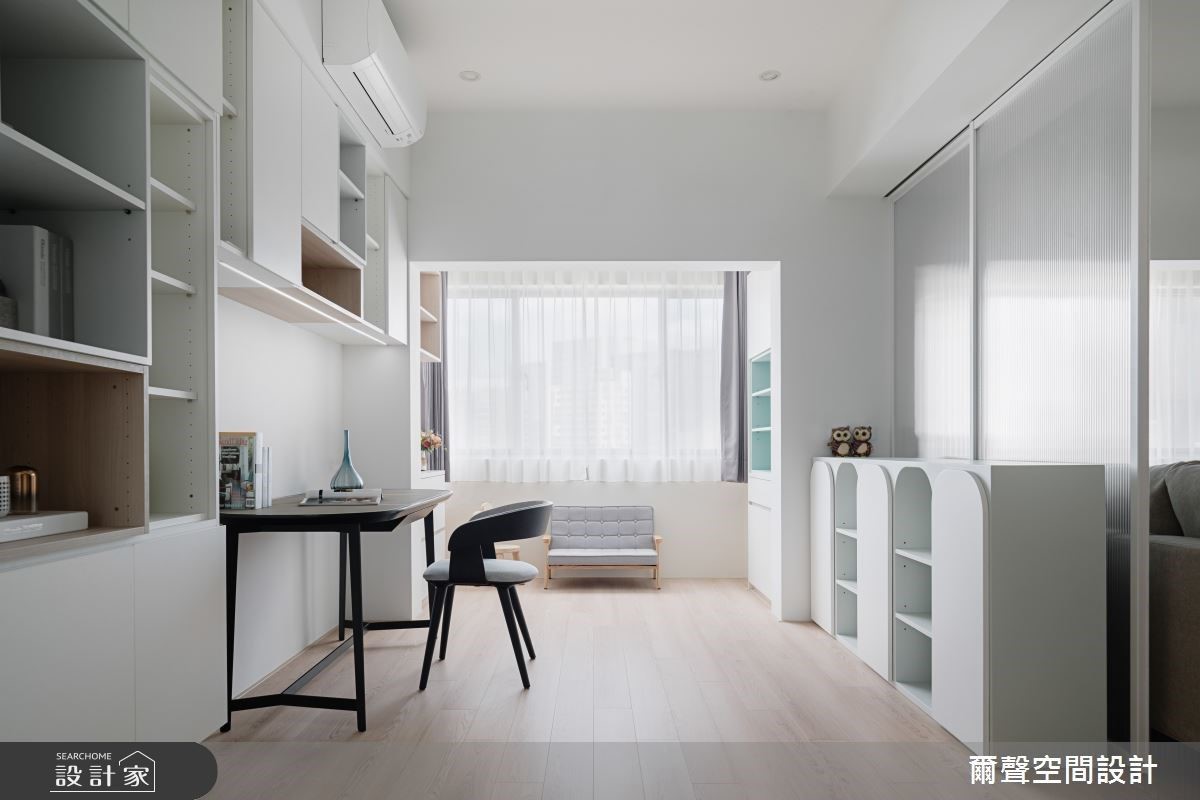 沙發後方的多功能室改以玻璃拉門與矮櫃取代實牆,以材質的改變,轉化出令空間通透的設計,讓光線與視線都暢通無比。由於男主人會在家工作,這裡也是小朋友的遊戲區,因此書桌收納配備完整,小朋友及大人的物品各有歸處,機能十足,空間卻簡潔清爽。櫃體穿插淡淡的薄荷綠,更是清涼無壓的配色技巧。左側內縮後,留出更大的通道轉寰空間,拉上拉門,露出的書櫃成為意外裝飾,讓牆面不致平淡呆板。