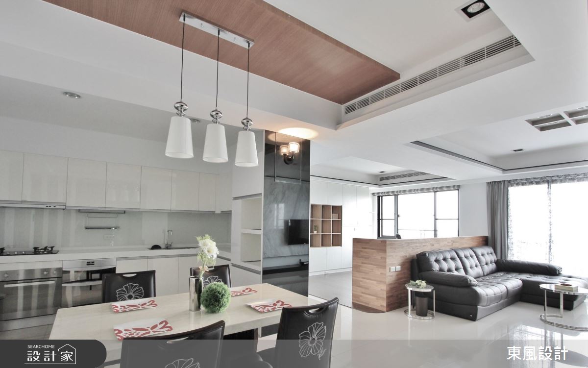 順著空間樑柱結構自然劃分出的餐廚區域,天花板利用實木拼接作為餐燈基座,不需要特別做區隔,善用原本空間的結構在開放式場域規劃出空間屬性,不論家人在哪個場域都能看到彼此,讓家人間的情感更緊密。