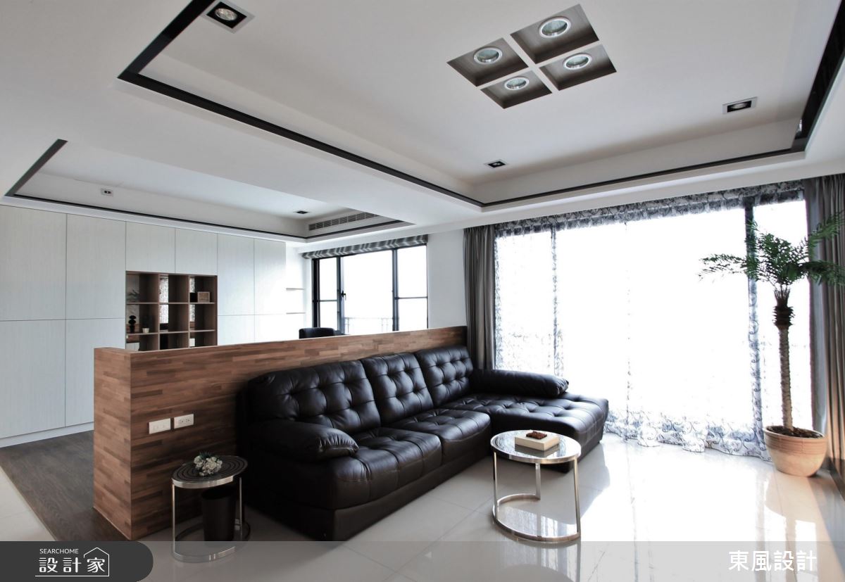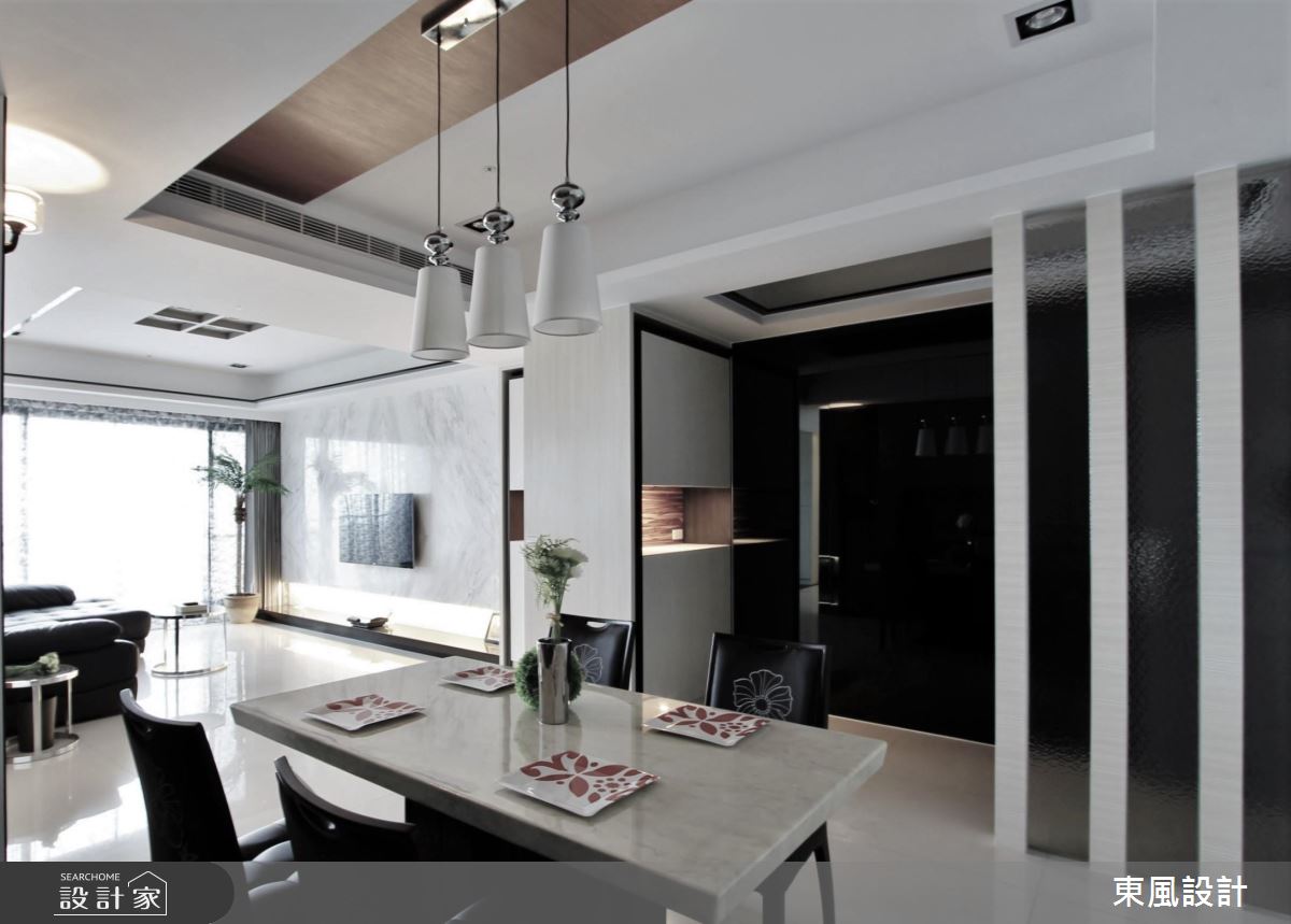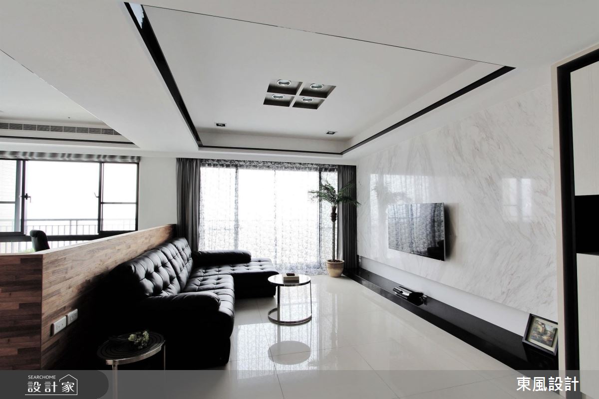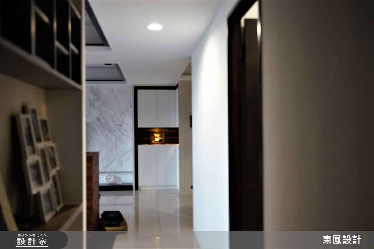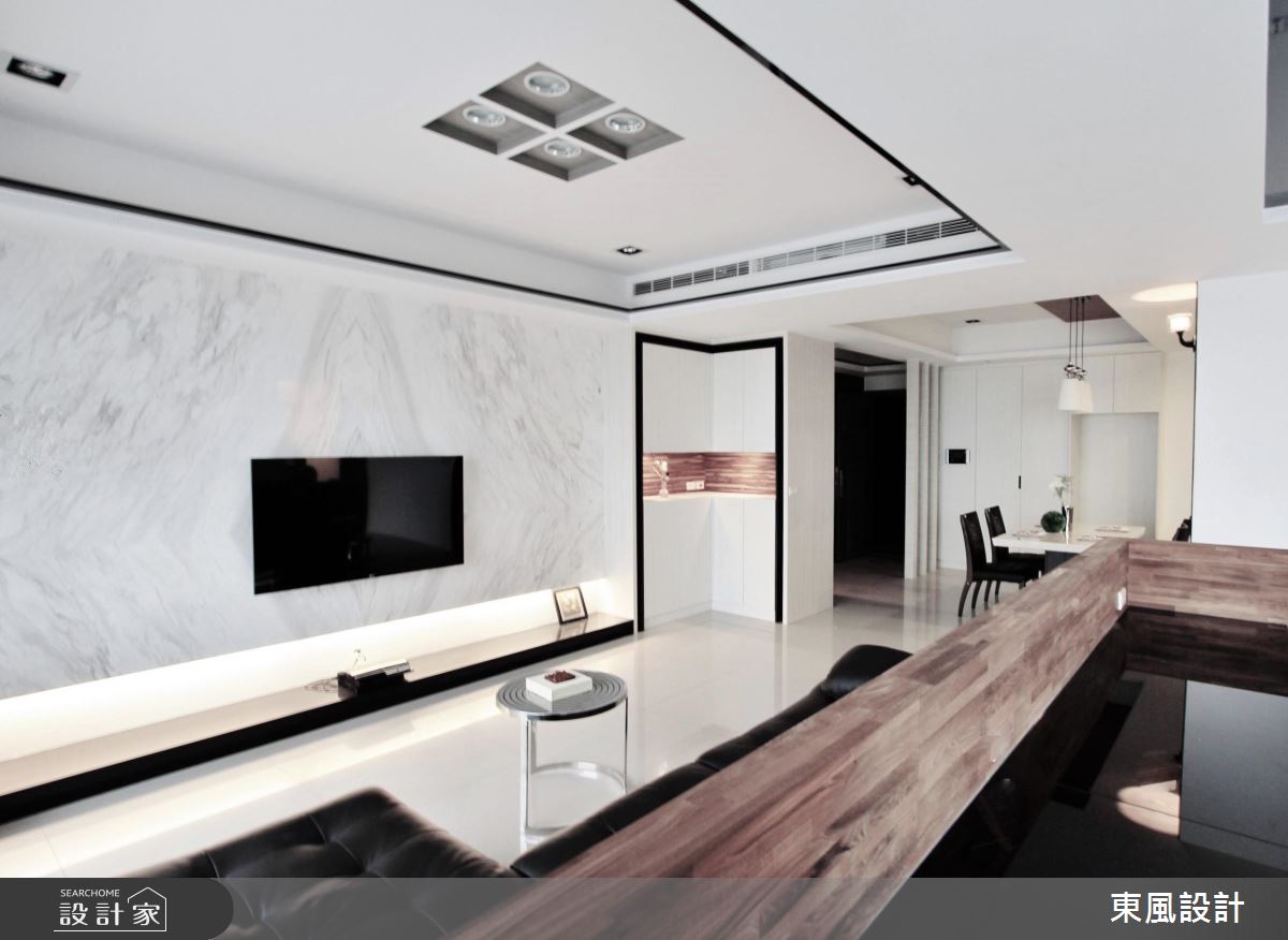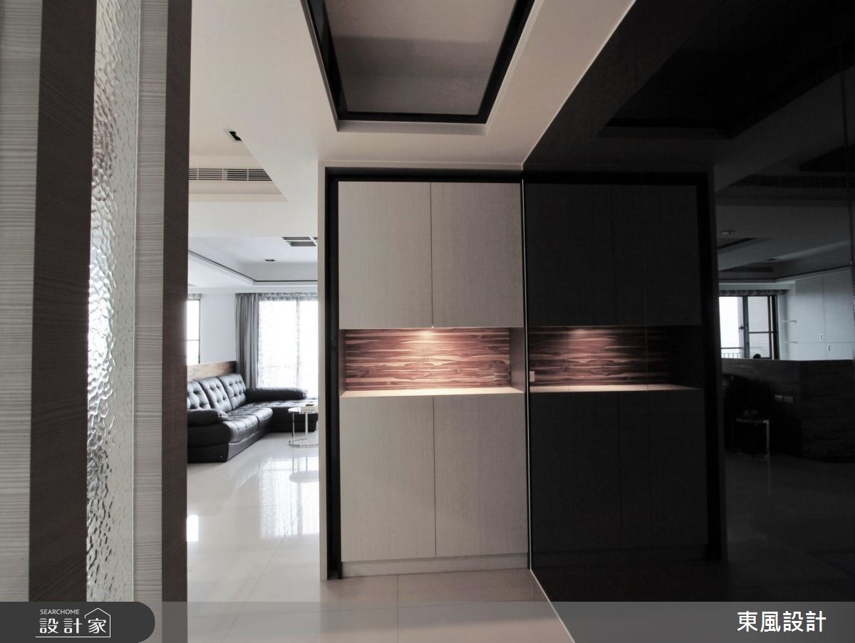 50坪的空間雖然很寬敞,但是沒有妥善規劃也是會無端浪費地坪阻礙動線。有別於一般玄關,刻意用黑色玻璃牆面鋪陳,溫和的反射端景將視線引領到室內。系統櫃雙面設計的巧思將外側玄關櫃與內側收納整合成一體,利用轉折處消弭平面收納的單調性。白紋大理石承接櫃體的白色一路延伸至天花板與地面,黑色邊勾勒凸顯現代設計,也讓空間裡的樑柱被弱化,形塑寬敞方正的公共區域。