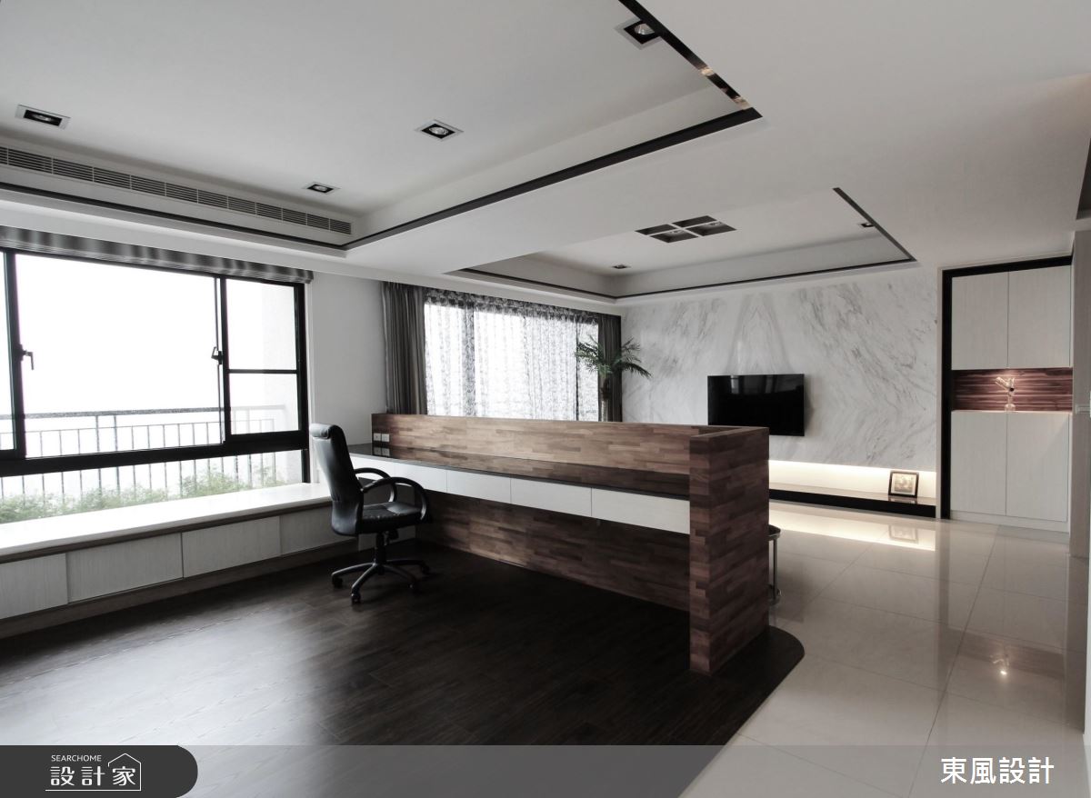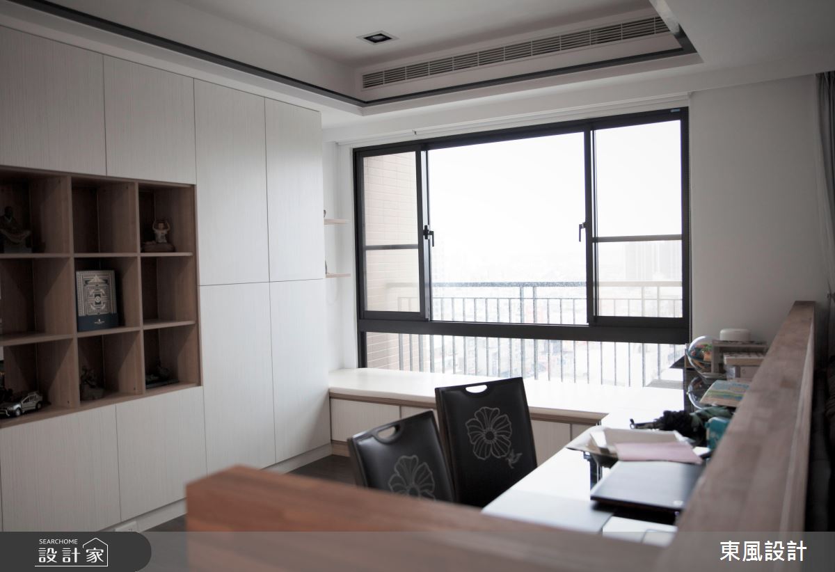 開放式的書房用地材轉換界定空間,後方大面積系統櫃取代白牆,中央安排格狀收納賦予背牆更多的變化,靠近採光窗的區域做了簡易臥榻,下方一樣也崁入收納系統。利用牆面與轉折處安排收納系統能減少不必要的地坪浪費、空間整體劃一,在簡約俐落的現代風格中也能保有各場域專屬的收納機能。