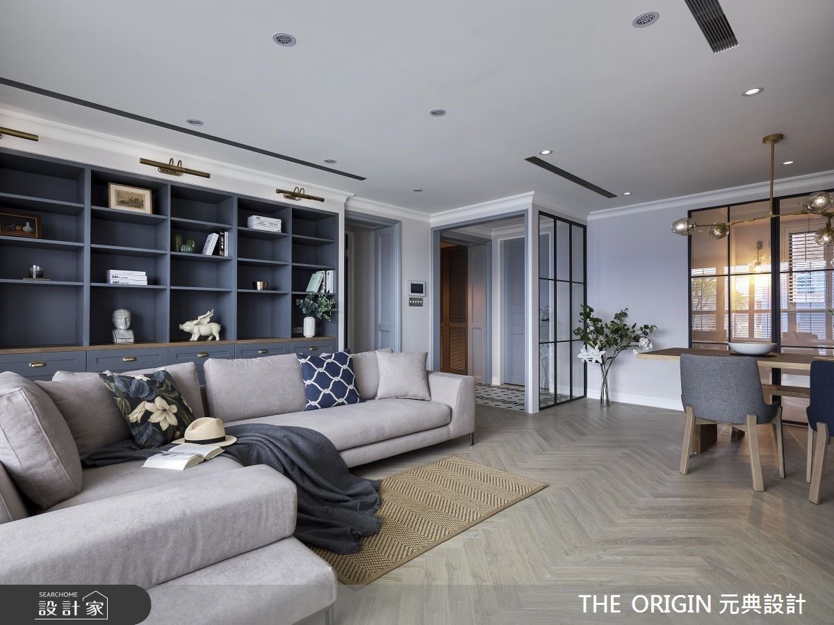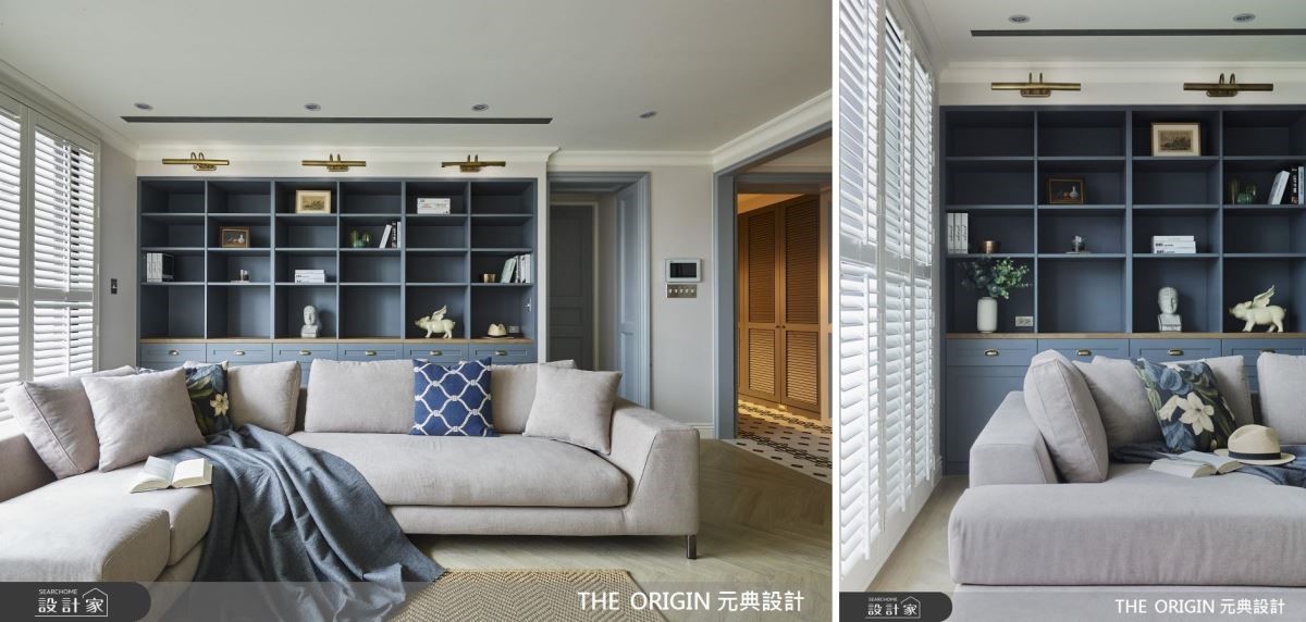 本案承襲美式風經典元素,透過燈飾、家具、軟裝等烘托優雅情境,同時於客廳建構一整道灰藍色展示櫃,透過低彩度的柔和背景,讓珍藏品、書籍化為視覺主角,並在櫃體頂端裝設黃銅色照畫燈,達到畫龍點睛之效,值得一提的是,就連開關、插座等細節都仔細考究,選用屋主習慣的指撥開關,讓美式風情更加到位。