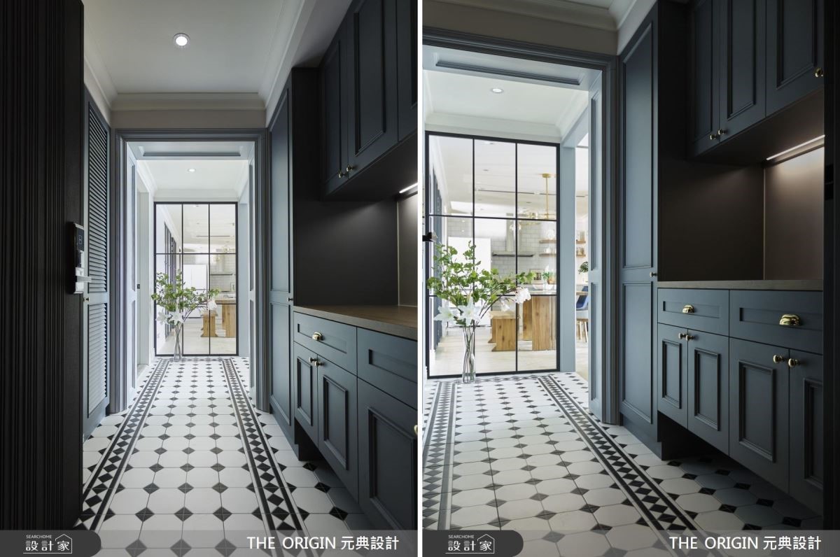 美式風居宅經常可見長廊式玄關,於牆面安排一整排深灰藍色鞋櫃,並加入細緻線板、古銅把手等修飾櫃面,地面則鋪敘黑白棋盤格地磚,展現充滿古典氣質的入口場景;延伸至盡頭,安置了鐵件結合玻璃的通透屏風,不僅延展視覺景深,也經由動線轉折,營造進入公領域後的豁然開朗感受。