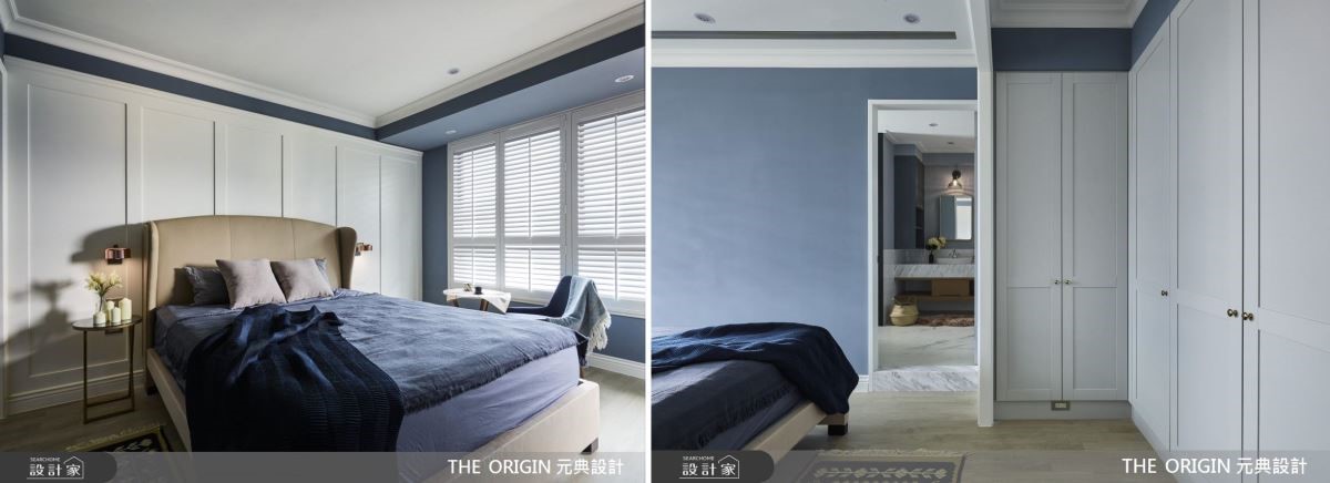 從公領域到臥房,皆承襲「灰藍色」主題,藉由深淺各異的灰藍色調,創造每個領域的精采層次。尤其當臥房揮灑沈穩色彩,更提升了沉靜的休憩氛圍,搭配線板勾勒天花、白色飾板裝飾床頭等,讓空間洋溢著濃郁的美式風情。同時也配置獨立更衣室,結合層板、吊桿、封閉式櫃體等,滿足多元收納形式。