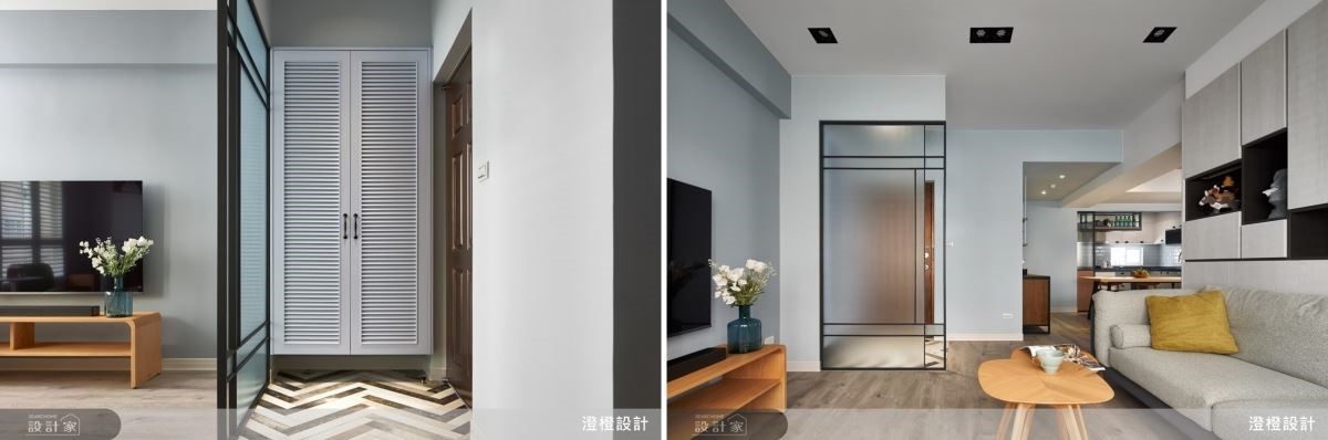 選用木紋磚以人字拼法鋪陳玄關地坪,打造活潑的玄關場景,並於一旁安置鐵件玻璃屏風,排解開門見窗的風水問題,藉由噴砂貼紙、長虹玻璃的雙重裝飾,增添玻璃外觀的變化性,達到透光與透視的功能,讓人一回家即可感受到滿滿的明亮與溫馨。