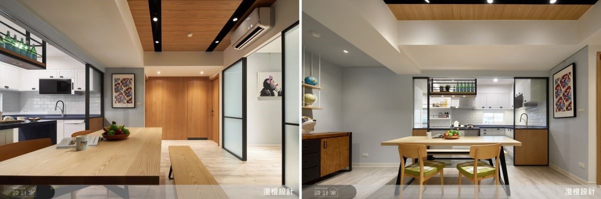 改善不流暢的動線,將餐廳位置挪移,劃出多功能書房前方的走道,而針對頂上樑柱問題,則不封天花板、改以木質修飾鋪敘,弱化樑的突兀感,讓整個空間既保有垂直的空間感,並同步延展出廊道動線。而書房的長紅玻璃門片與廚房的清玻拉門,都促成了場域之間的採光交流,讓餐廳區塊更為明亮溫馨。
