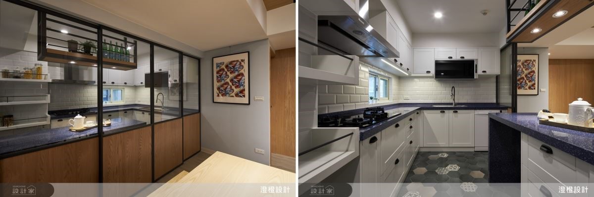 來到廚房,以簡約的廚具線板創造細節,壁面則鋪陳白色地鐵磚,並以深藍灰色的人造石料理檯面做跳色,帶出輕美式的時尚氣息,同時選用木皮搭接玻璃、打造廚房拉門,在阻絕油煙的同時,也與一旁餐區共享了光線。