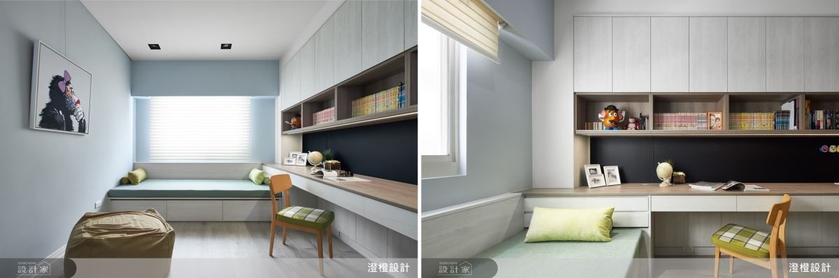 將牆面稍做更動,讓客廳、書房共用一道立面,前方為沙發牆展示櫃,後側則作為書房的書櫃,透過雙面櫃的設定,讓客廳、書房都獲得更寬敞的空間感。而目前的書房,未來也可能成為小孩房或客房,加入了抽屜式臥榻、磁鐵黑板牆面等機能,讓空間更可被多元利用。