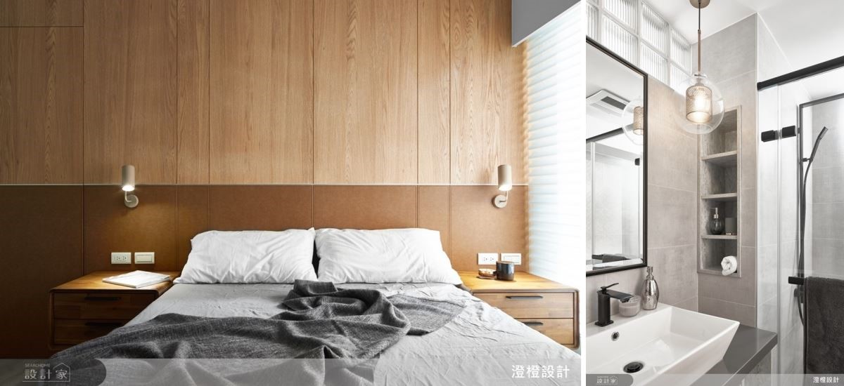 主臥空間,在床頭鋪陳馬鞍皮加車縫線妝點,並於上半部鋪敘淺色木皮,透過溫潤與時尚質材交融,展現異材的混搭趣味,但卻無損畫面的協調性。衛浴內,則在洗手台旁設計壁龕、更貼近使用習慣,並在壁面上方加入玻璃磚,與客衛共享採光,緩解主浴無窗的光照問題。