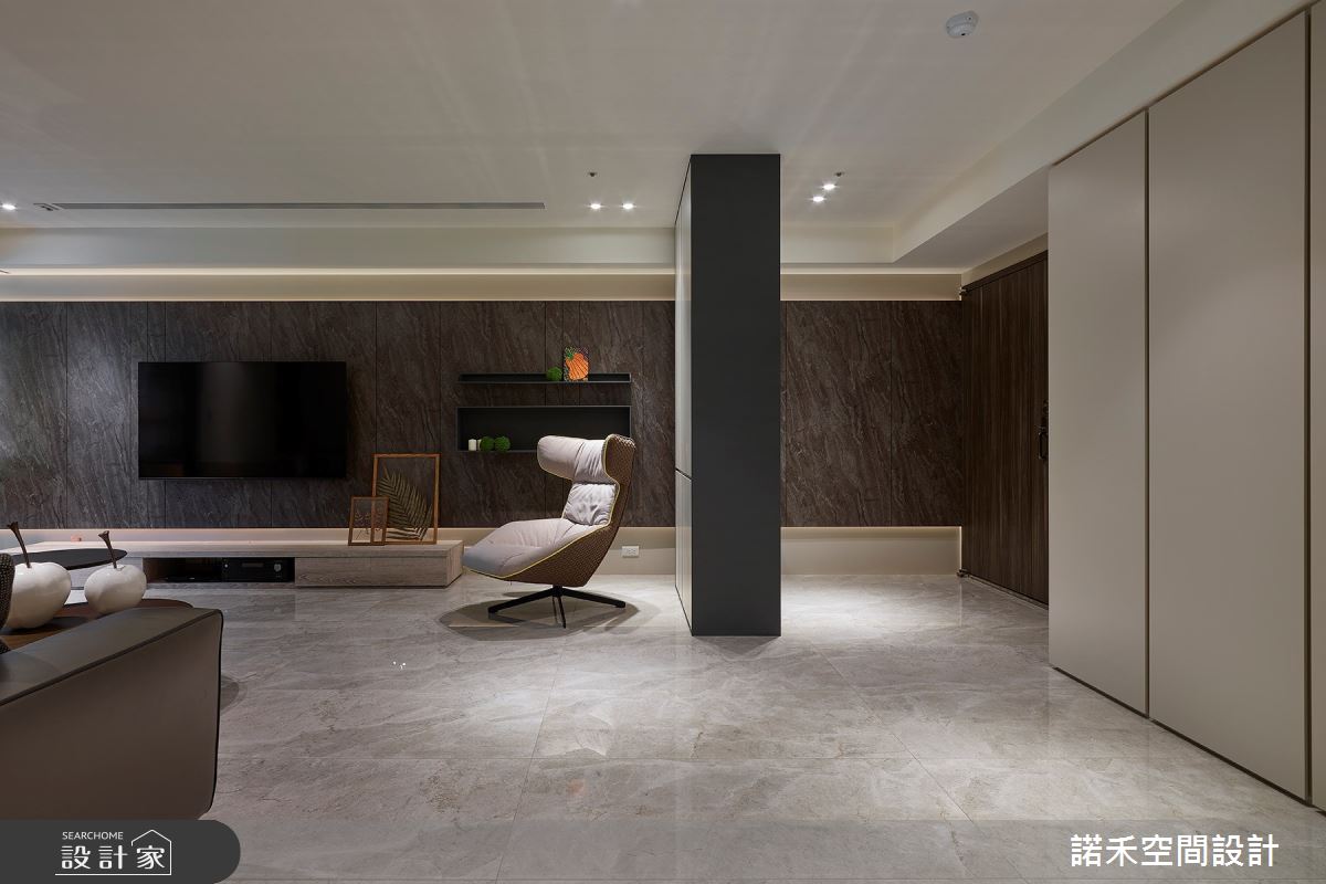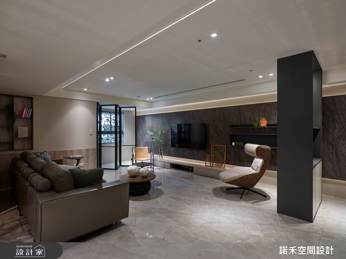 客廳電視牆僅用鋼刷木皮就營造出沉穩大器氛圍,也為空間迅速定調都會質感。