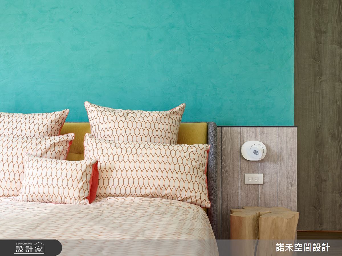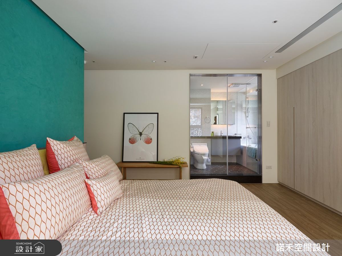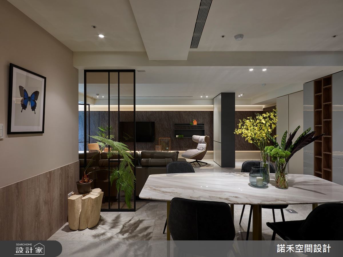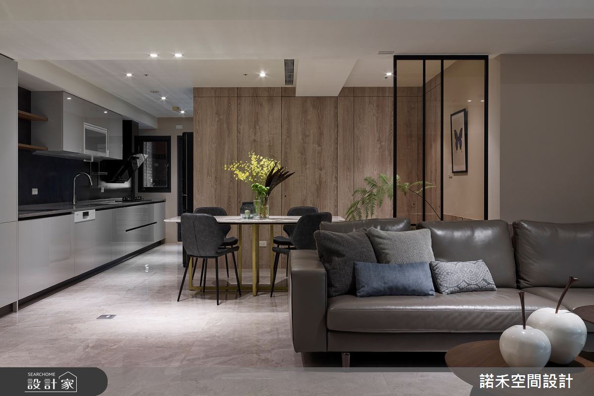 空間中以層次相間的咖啡色系為主軸,一進門整片的鋼刷木皮從玄關延伸至客廳電視牆營造沈穩的氛圍,並在入口處以雙面櫃體提供收納,並區隔出玄關落塵區化解開放式公共場域的風水問題。天花利用帶狀光條與間接照明呈現多樣化的空間氛圍情境,並巧用玻璃摺疊門與茶玻屏風作為界定,讓視覺感到通透輕盈,而玄關通往廚房側運用大面積的櫃體則滿足生活上的收納需求。轉入私人領域,有別公共空間的大地色調,利用床頭的牆面做跳色,草綠色帶來活潑、青春氣息,衛浴有如飯店般選用玻璃門片引入自然採光,屋主也能在個人天地裡肆意遨遊。