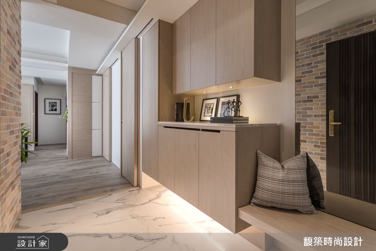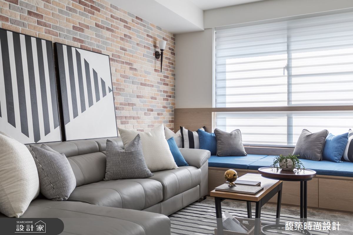玄關地面選擇進口磁磚與室內木紋地板作出區隔,而鞋櫃與穿鞋椅的機能組合也讓屋主方便穿脫、收納各種鞋款。顏色不一的文化石材質自玄關牆面延伸至沙發背牆,引導清楚的空間動線。客廳灰色沙發與水藍色臥榻的配置,給屋主更多元的運用彈性,無論是閱讀、休憩或聊天都很適宜,而臥榻旁的畸零空間則被用來當作展示區域,成為表現屋主品味的一角。