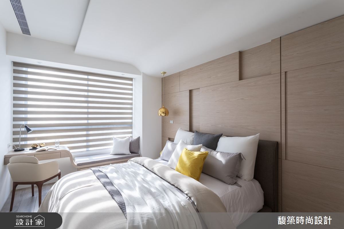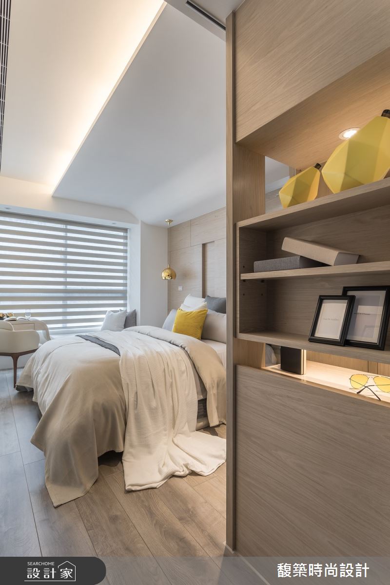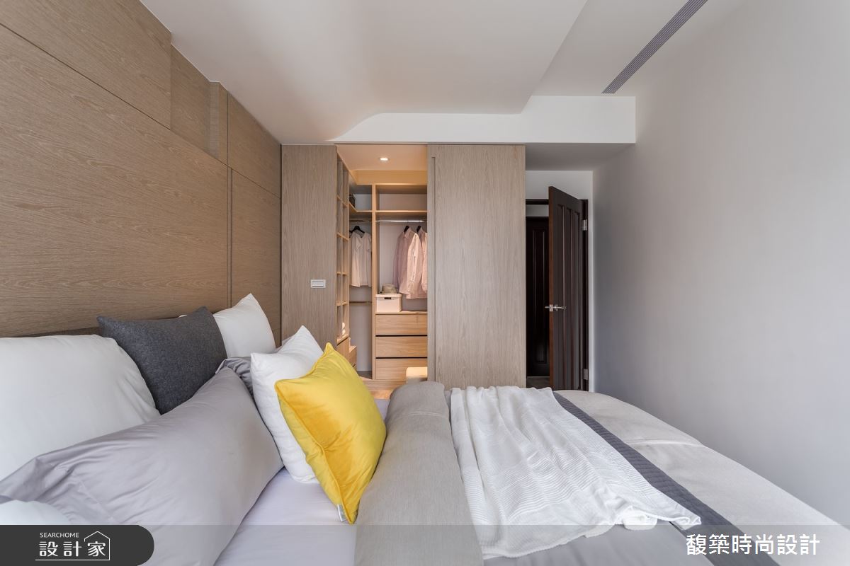 主臥床頭牆採取立體造型隱藏衛浴入口,上方天花板則選擇弧形設計,減少大樑的突兀感,而更衣室則透過櫃體局部鏤空的方式,保持視覺的一定開放度,讓女主人在裡頭不會感到壓迫。