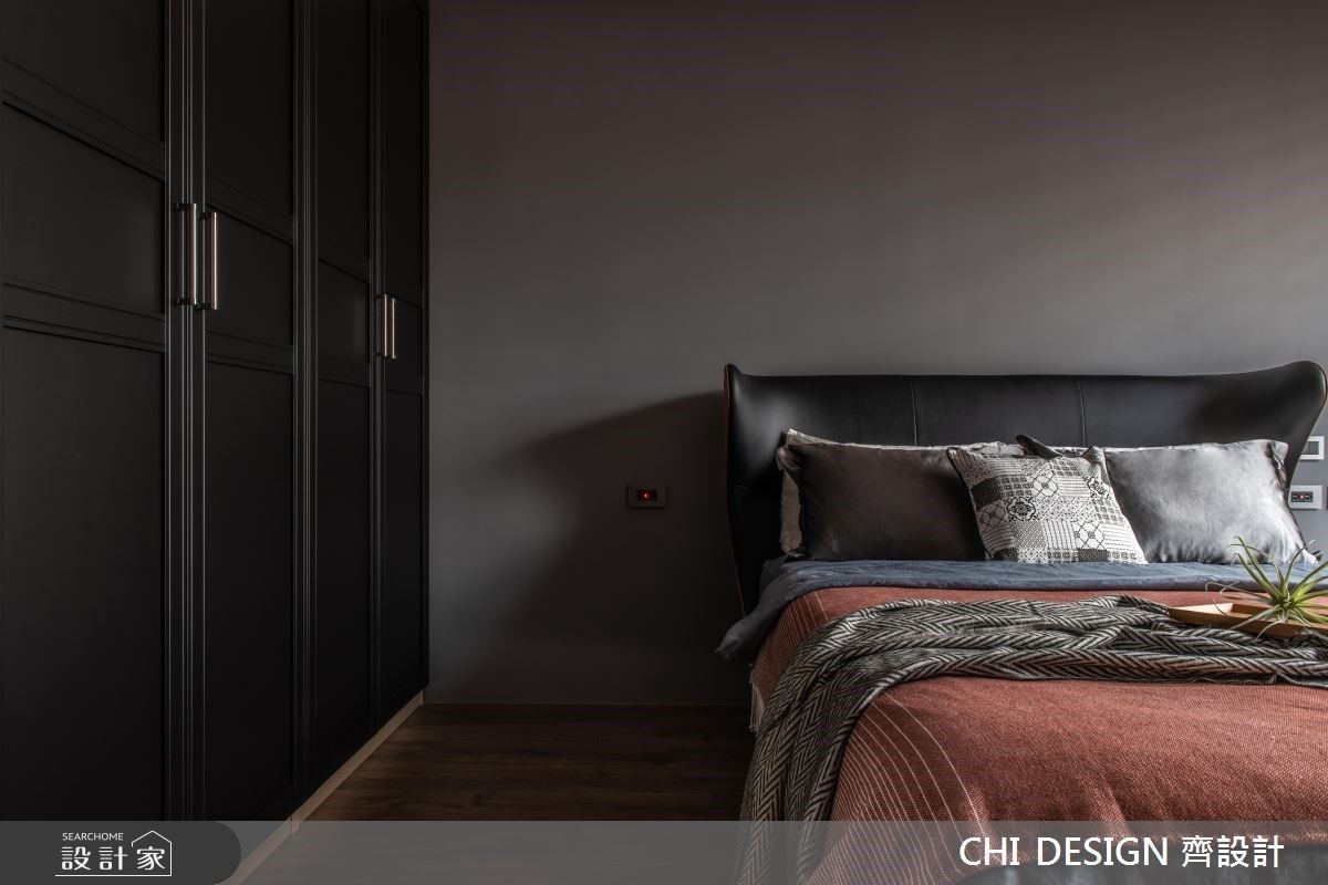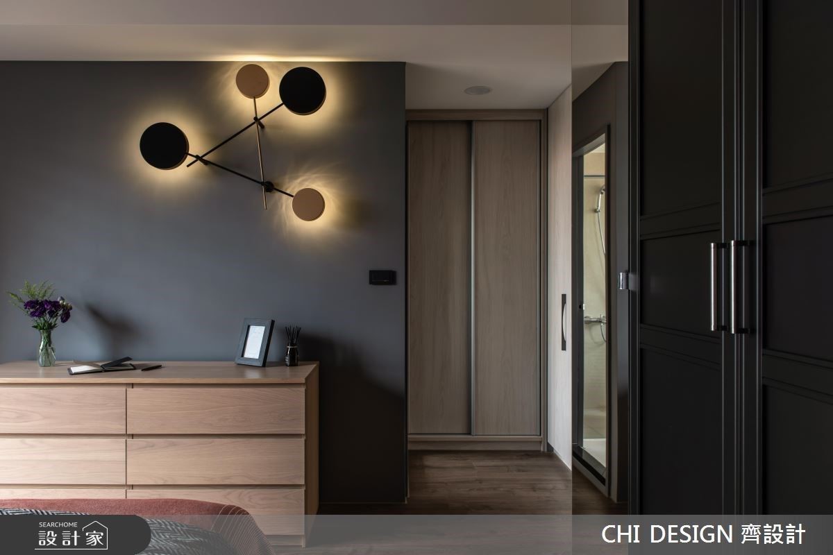主臥牆面以高雅灰為主視覺,床尾的造型壁燈為空間增添活潑感;小孩房設置床頭櫃,櫃子上方能擺放樂高公仔,側邊則擁有收納機能,而藍色牆面利用間距不一的線條,化解門板產生的突兀,形成清新悠閒的睡眠環境。