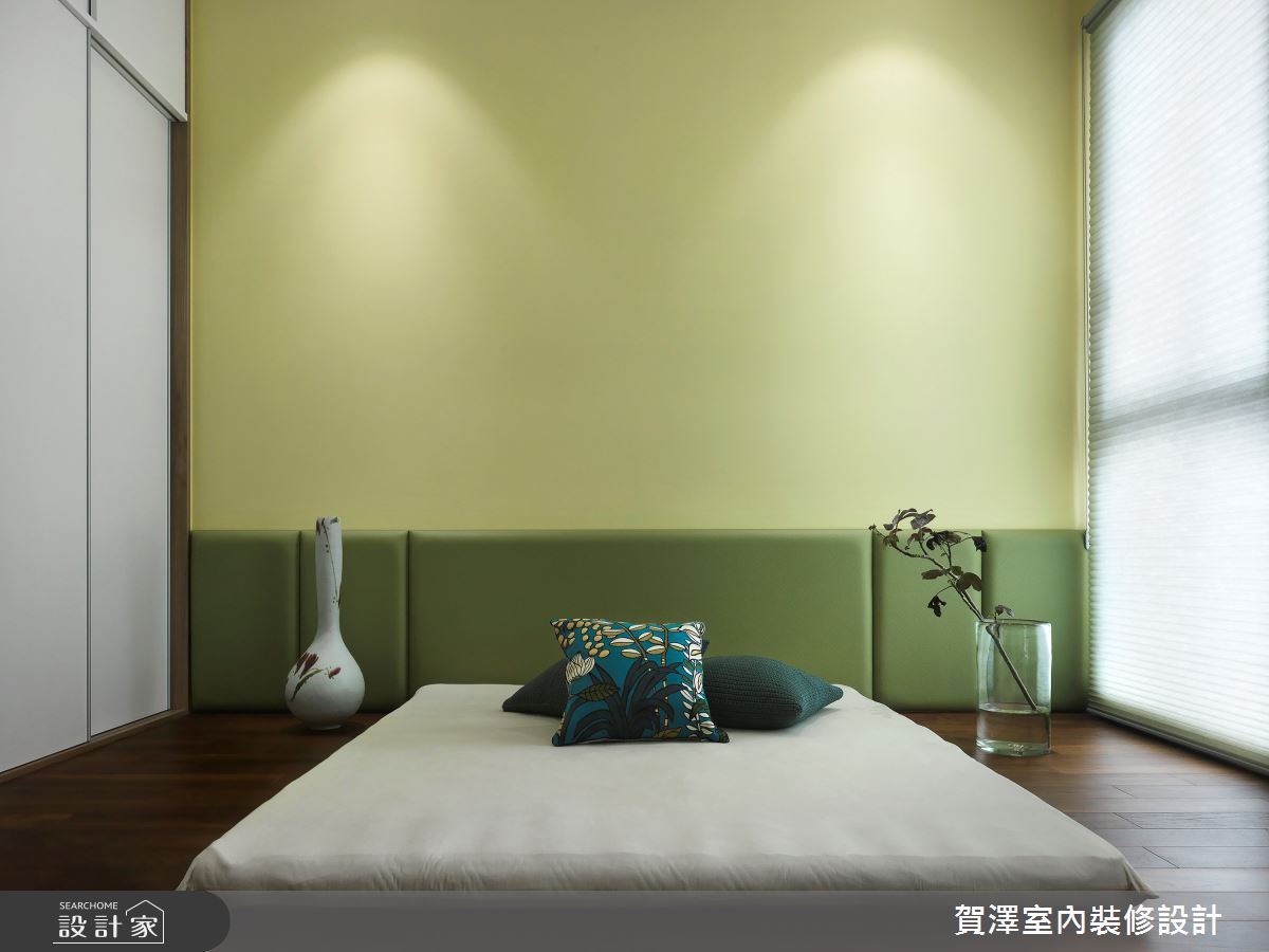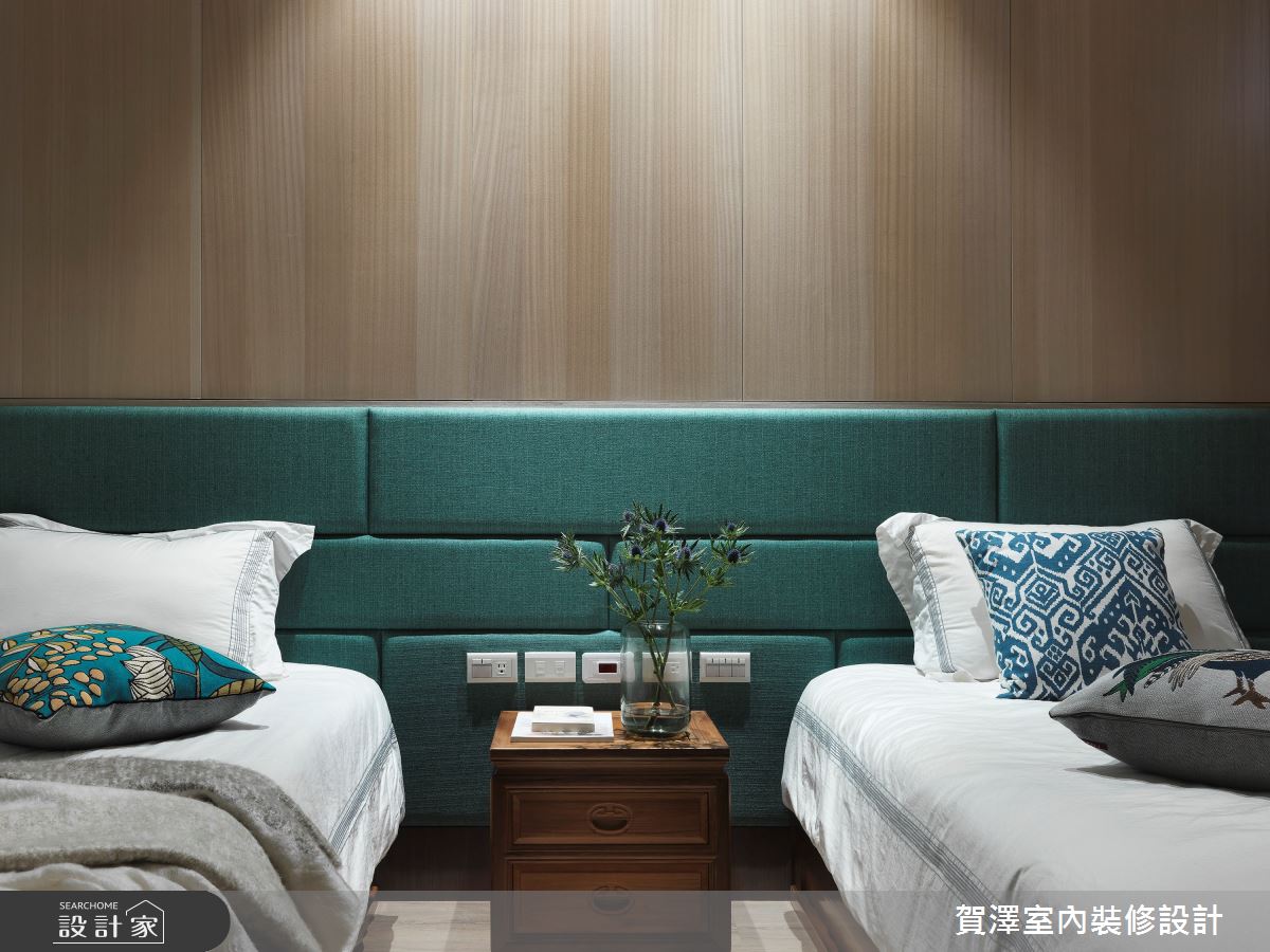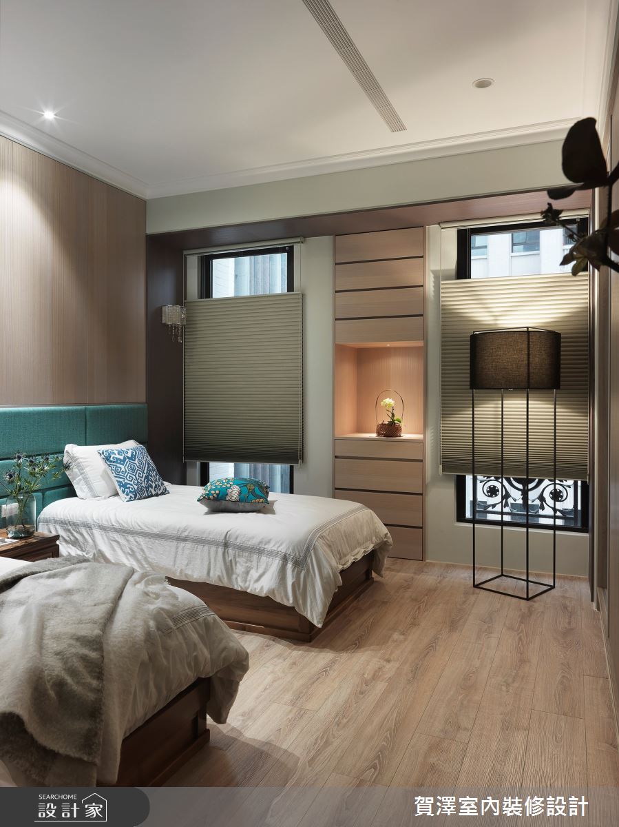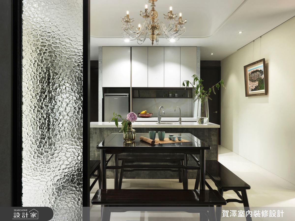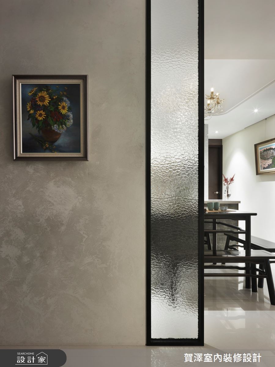 入口玄關以特殊漆結合鐵件並鑲嵌小銀波玻璃,兼具細膩與粗獷質感的屏風,可避免一進門就瞥見房門的窘況。整體公領域,以大量的白色為基底,乾淨、簡潔的視覺設計讓空間更為敞朗明亮,同時烘托實木家具的樸實、溫潤,並透過特殊漆紋理的壁面,與鍍鈦金屬材質的妝點,隨著光影的變化,傳遞出細膩質感與多變風情;從入口大門到客廳主牆,利用金屬光澤與砂紋理的特殊漆整合造型,結合中段結合古銅色鍍鈦金屬條,展現現代新意;天花板則利用弧形線條勾勒,修飾大樑、美化銳角線條,而開放式格局的室內規劃,也拉進家人間的距離,增加互動性;餐廚空間整併,復古味道的深色原木餐桌椅,搭配釉綠墨紋薄板磚與鍍鈦金屬條打造的現代中島,達到中西合併的美學展現。