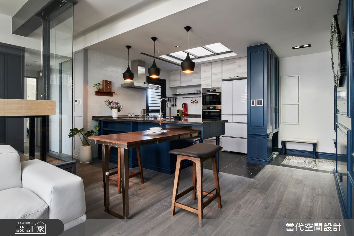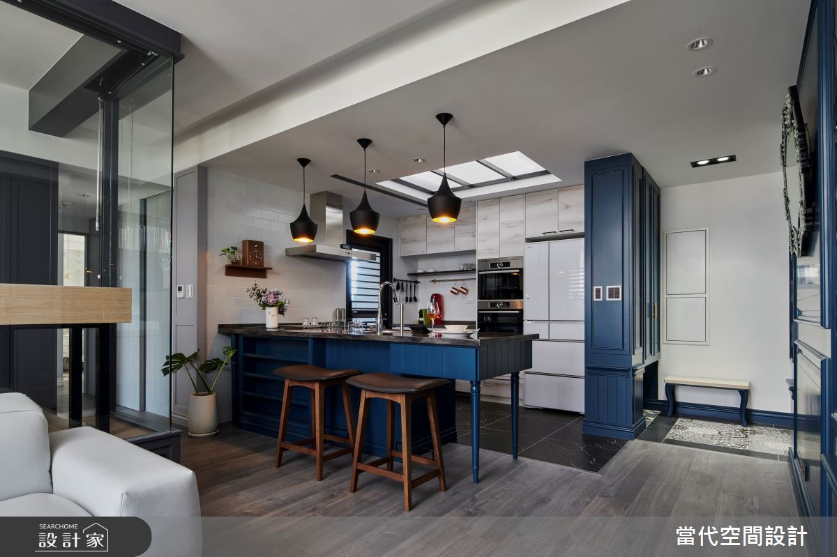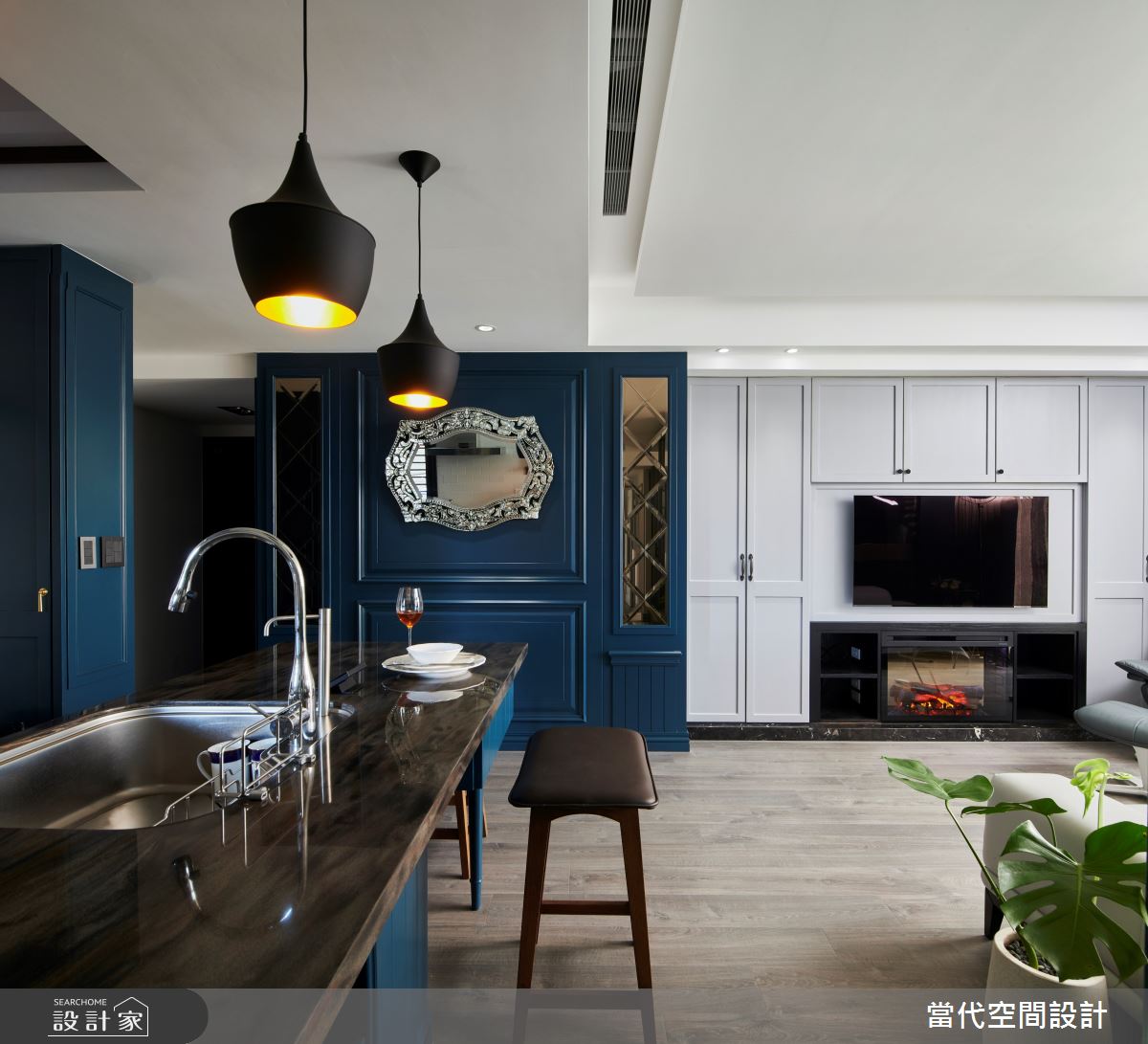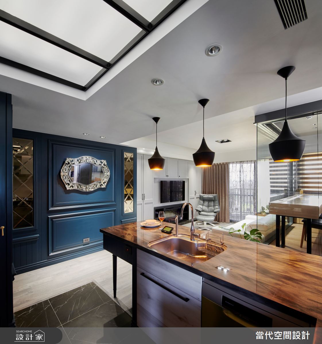 因為原本的三房兩廳的格局顯得空間昏暗窄小,當代設計透過拆除客廳後方一房改為玻璃隔間的半開放書房,令兩廳更顯開闊。玄關黑白花磚與普魯士藍櫃體延伸至廳區為公共空間的古典奢華鋪出序曲,向後退縮的電視牆面施以灰色調與同色系的沙發讓空間感放大,而後方半開放式的書房加大且延伸了公共區域的視覺感,架高設計更是大幅增加了收納量,不僅美觀又兼具實用機能。廚房是屋主非常重視的空間,原本的機能完全不敷使用,因此設計師重新調配空間位置,並以大中島滿足使用需求,再加上隱藏式餐桌,不用去小酒館也能享受餐廳愜意氣氛。