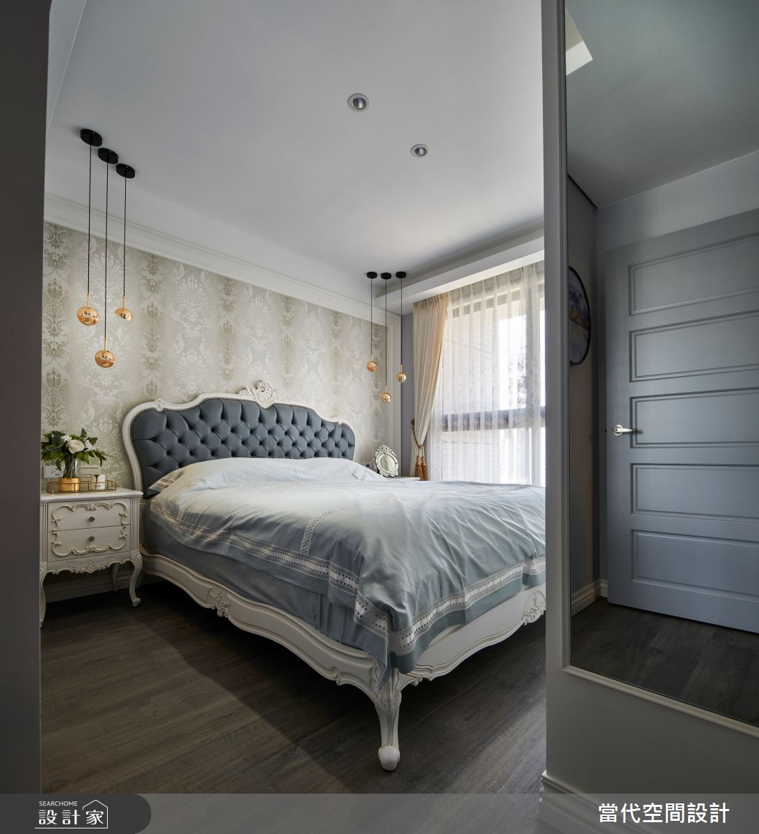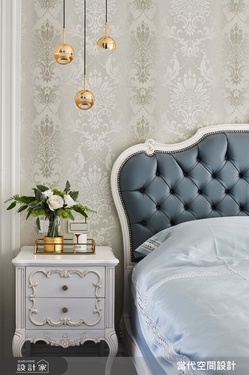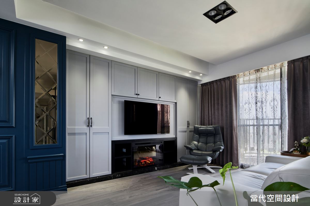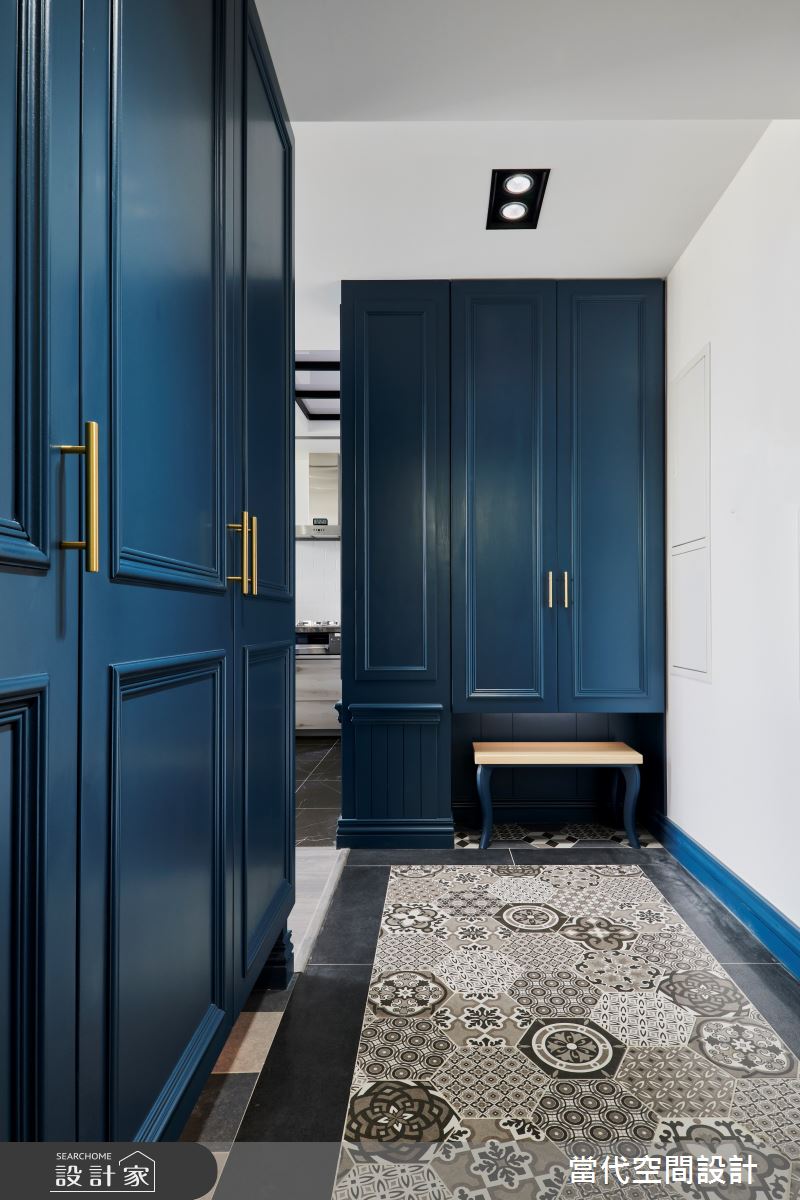 因為原本的三房兩廳的格局顯得空間昏暗窄小,當代設計透過拆除客廳後方一房改為玻璃隔間的半開放書房,令兩廳更顯開闊。玄關黑白花磚與普魯士藍櫃體延伸至廳區為公共空間的古典奢華鋪出序曲,向後退縮的電視牆面施以灰色調與同色系的沙發讓空間感放大,而後方半開放式的書房加大且延伸了公共區域的視覺感,架高設計更是大幅增加了收納量,不僅美觀又兼具實用機能。廚房是屋主非常重視的空間,原本的機能完全不敷使用,因此設計師重新調配空間位置,並以大中島滿足使用需求,再加上隱藏式餐桌,不用去小酒館也能享受餐廳愜意氣氛。