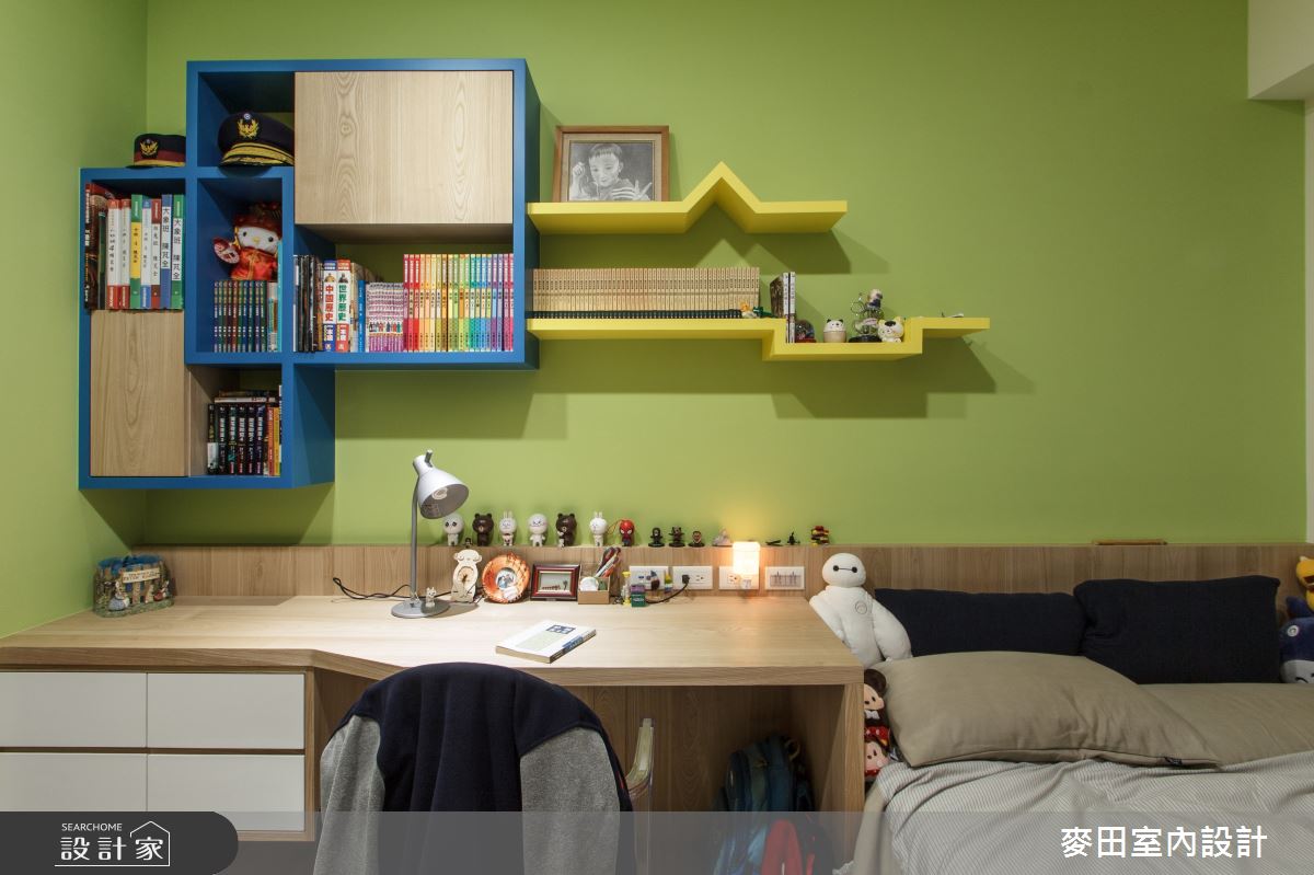 從玄關入內,藝術牆面勾勒金邊畫出落塵空間,其有如屏風去除穿堂煞的風水疑慮,另一面亦是電視牆面,機能相當多元。玄關左側則為開放式的書房空間,架高的平台設計隱形界定場域,也為走進生活場域提供一個緩衝帶,設計師也運用此動線設計大量隱藏門片櫃體解決一家的收納需求。而沒有隔間的客餐廳搭配較低的沙發與餐桌椅令空間感受放大,也因此無論家人是在讀書、看電視或是料理都能隨時陪伴。主臥延續空間簡約自然的風格打造舒適的睡眠氛圍,窗戶增加滑動鏡片作為化妝鏡使用深具巧思,而兩間小孩房則運用湛藍、草綠做跳色,增添活潑氣息。