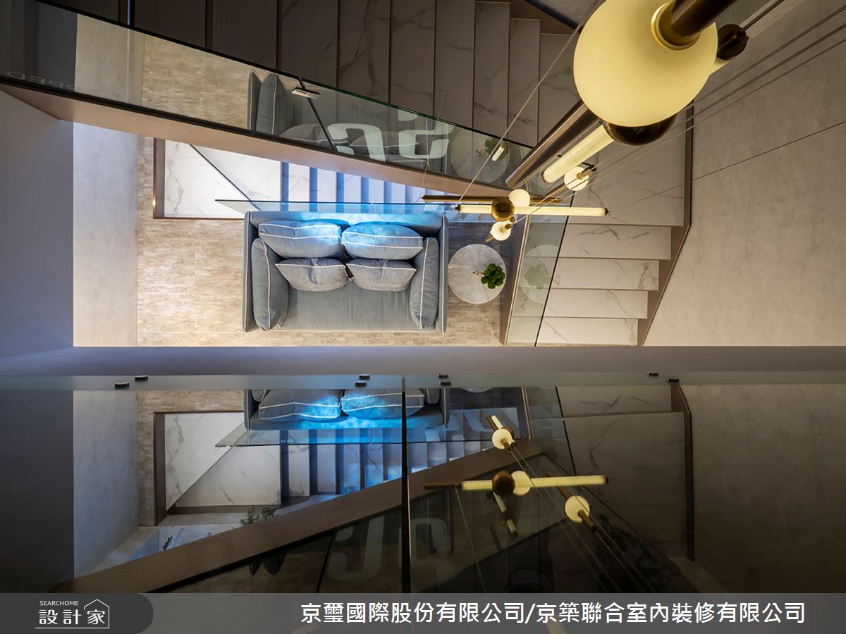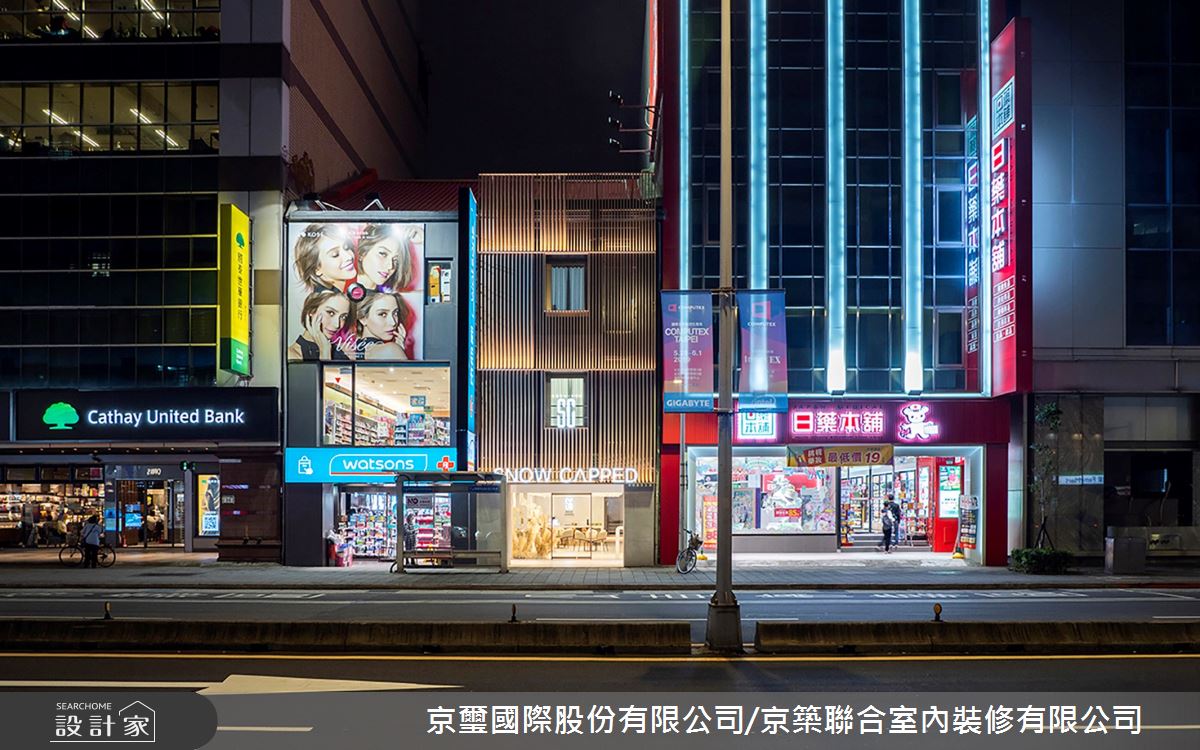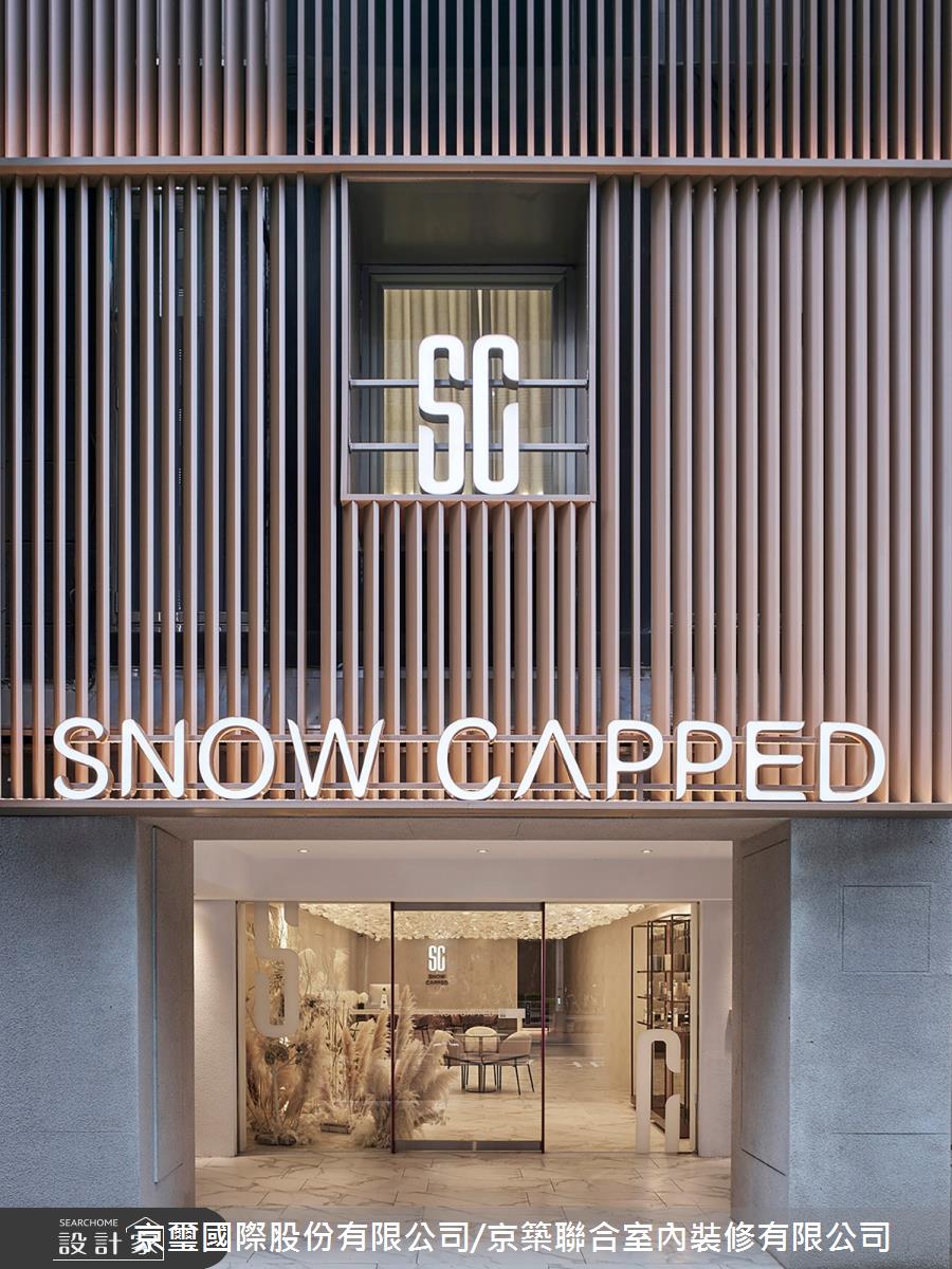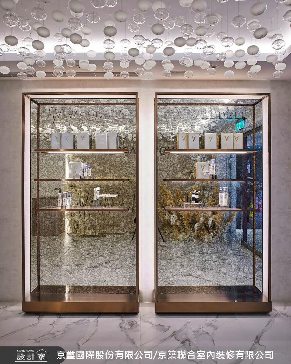 外牆的金屬格柵在燈光投射下,於城市街景中呈現不容錯過的美麗容顏,而大理石紋地坪從室內傾瀉而出,延伸至騎樓的室外廊道,優雅質感令人不禁駐足欣賞。一樓洽談區透過大面積的白,襯托出仿古鏡展示櫃、鍍鈦金屬櫃檯及花藝擺飾的立體感,而佈滿天花板的玻璃球與照明的巧妙結合,聚焦於每位賓客的美麗渴求,讓奢華時尚在空間漫步。