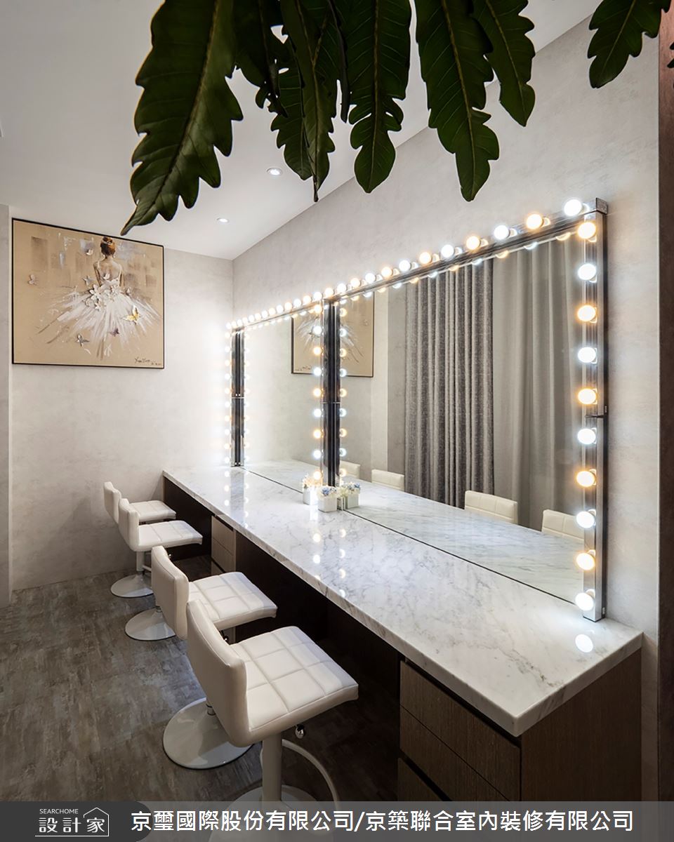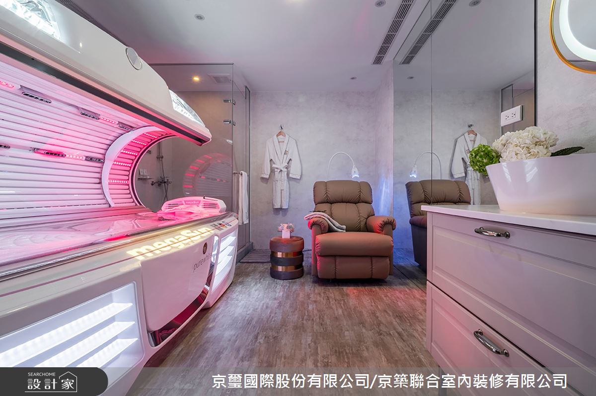 美體區採取帶有人文藝術紋理的壁紙,配合金屬鏡框燈具,創造出身心得以充分舒展的空間層次,讓人享有平靜和緩的美容時光。