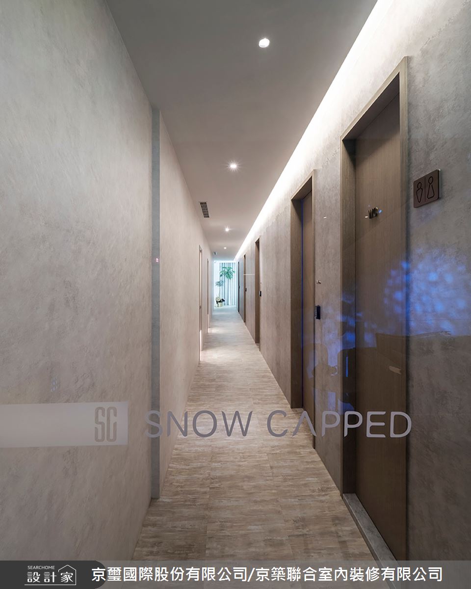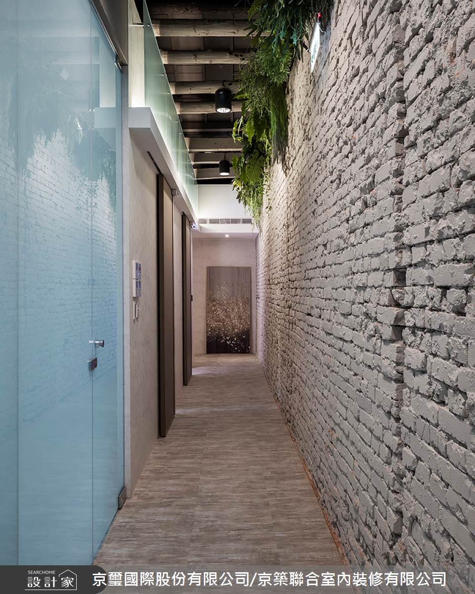 在串聯上下層的垂直動線,設計師選擇玻璃和石材的樓梯材質,創造輕重虛實對比的衝突美感。二樓廊道延續一樓白色主視覺,為賓客鋪排專屬的保養場域,帶來溫馨且別緻的奢華體驗。三樓則保留建築的原始磚牆,加上植栽與實木橫樑的妝點,表現新舊交織又充滿自然氛圍的鮮活魅力。