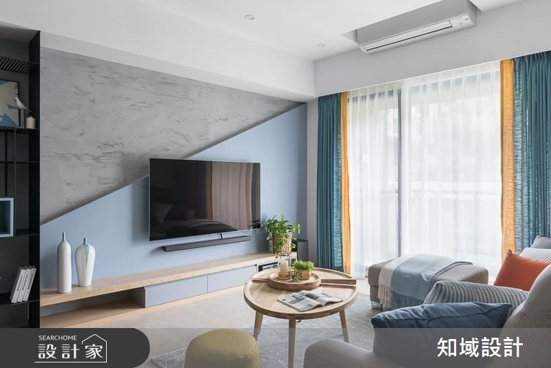 廳區大牆運用幾何切割線條,將收納櫃體和電視牆巧妙結合,並順理成章地切換異材質和色彩的表現。電視牆即以一道斜線展開藍與灰的對話,白色的封閉櫃體則以鐵件和木作輕化量體感,並以錯落的層板相隔,讓飾物擺出亮眼的端景牆。