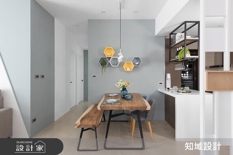 將淺灰語彙延攬到開放式的餐廚場域,並於深處刷上灰綠,讓灰階走進漸暖的層次;而跳色的藍和橘,透過蜂巢狀的六角格框,點綴綠意或展示小物,更見裝飾趣味。旁邊的中島,則以黑鐵吊櫃陳列紅酒和高腳杯,搭出輕鬆愜意的生活感。
