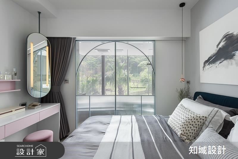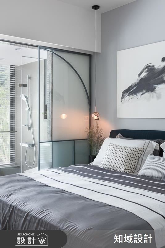 將原本全開放的臥浴,以玻璃拉門分界,並延續幾何語彙化身圓弧曲線,讓門片不單調,又柔化空間表情,既援引窗光打亮空間,下半霧面亦兼具隱私。化妝台的旋轉鏡也以弧線切角呼應,可錯開床頭的直接對應,風水、機能和美感都到位。