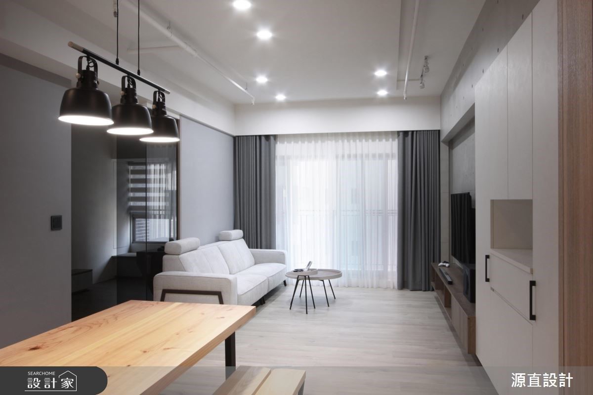 天花板凌亂的管線重整後,以部分封板、部分裸露的規劃,將排列整齊的消防管線刷以純白色漆,與軌道燈搭配融為天花設計一隅,成功爭取舒適的生活高度。大門敞開迎面而來的餐廚領域,透過相同的木質材鋪排於天花與立面,創造延伸感視覺;簡約單純的客廳區,則以清水模電視牆、灰階色漆面及木質收納櫃元素,散發出整室簡練個性,完美詮釋了黃金單身漢的質感生活品味。