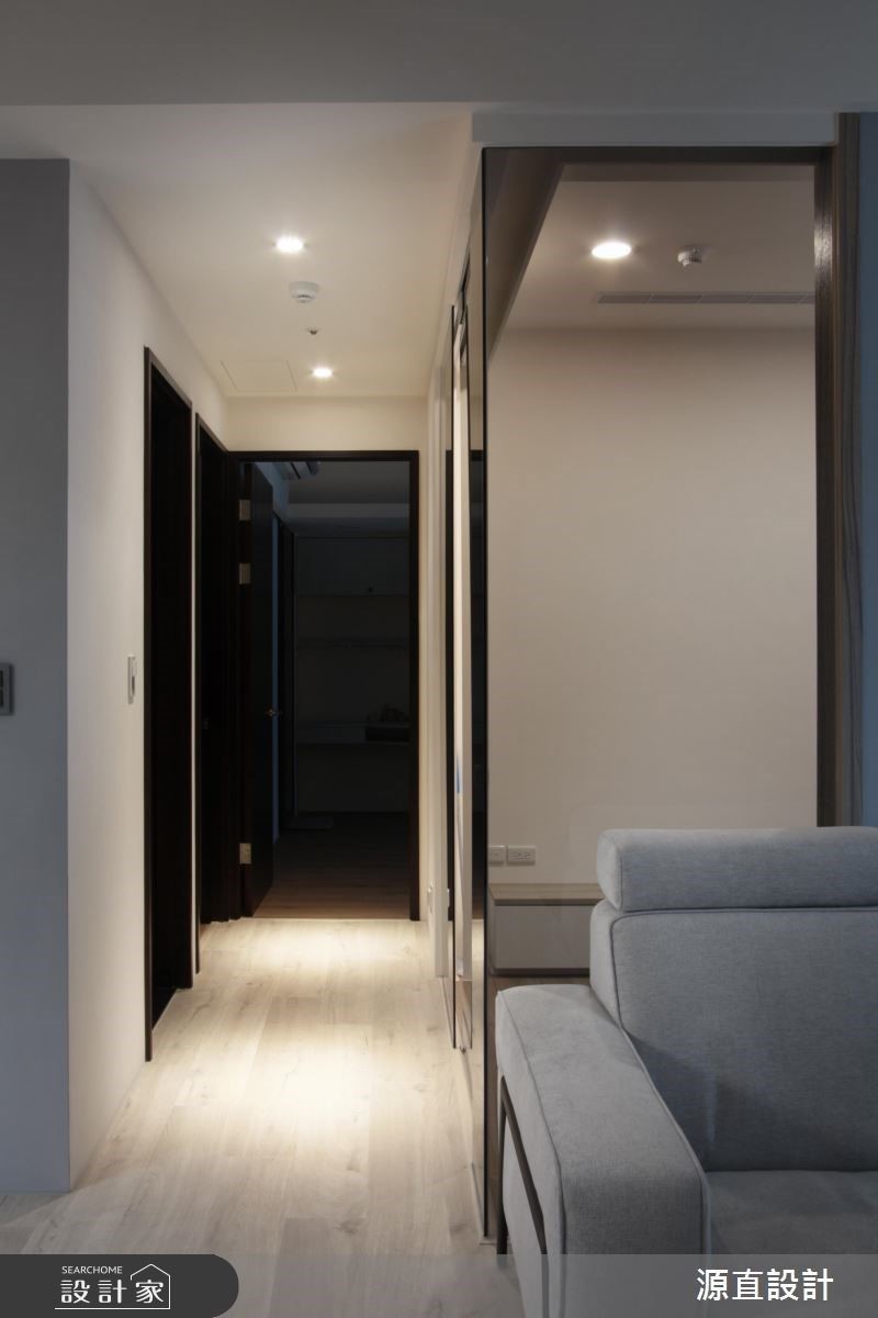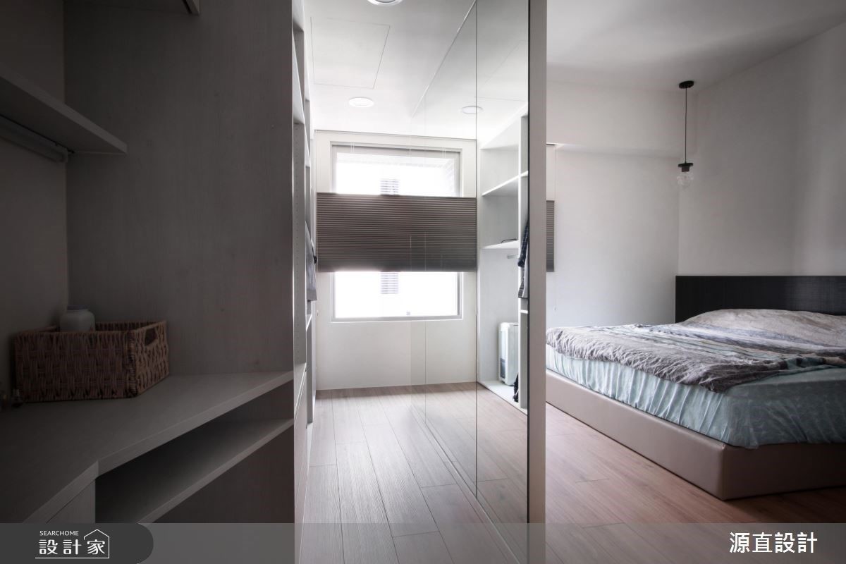 客廳後方的多功能書房巧用灰玻隔間,打造略帶隱私的通透視覺,並透過 L 型灰玻延伸規劃解決沙發背牆長度不足疑慮;而舒適好眠的放鬆主臥,也巧妙透過隔間牆鏡面建材放大了更衣場域,帶來整裝儀容實用機能。