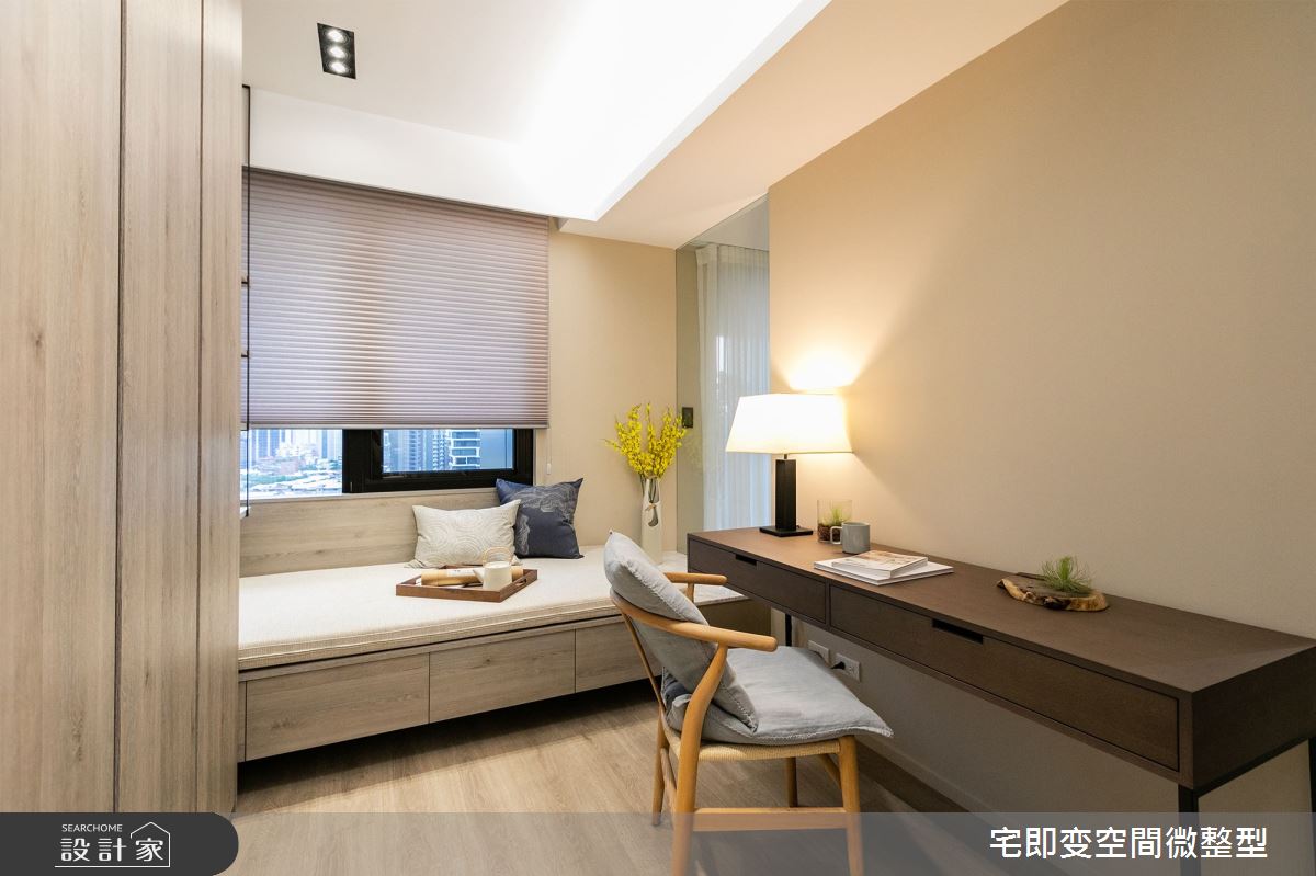 玄關木質大鞋櫃揭開溫暖且實用的居宅印象,一旁現代俐落的白色矮櫃搭配造形鏡面,跳脫整室木色空間,替迎賓處製造吸睛亮點。開放式客、餐廳領域共享落地窗外的好採光,木質桌椅、米色沙發及米灰色刷漆,皆透過同色系異材質搭配原則,賦予溫潤視覺空間層次美學;立面材料及家具擺件精準選配,白灰大理石紋理電視牆、藤製單椅、造型吊燈及大型落地燈,瞬間成為簡約空間的焦點。而坐落於廊道之間的餐廳區與各區塊互通有無,彷彿象徵凝聚生活情感的中心點,長型大餐桌則可依據生活需求轉變為開放閱覽空間。電視牆後方規劃了一間多功能書房,玻璃拉門巧思拉進了家人之間的距離,房內不僅提供大容量儲物空間,可隨時轉換為過夜客房的窗邊小臥榻設計,則注入了完備的生活機能。