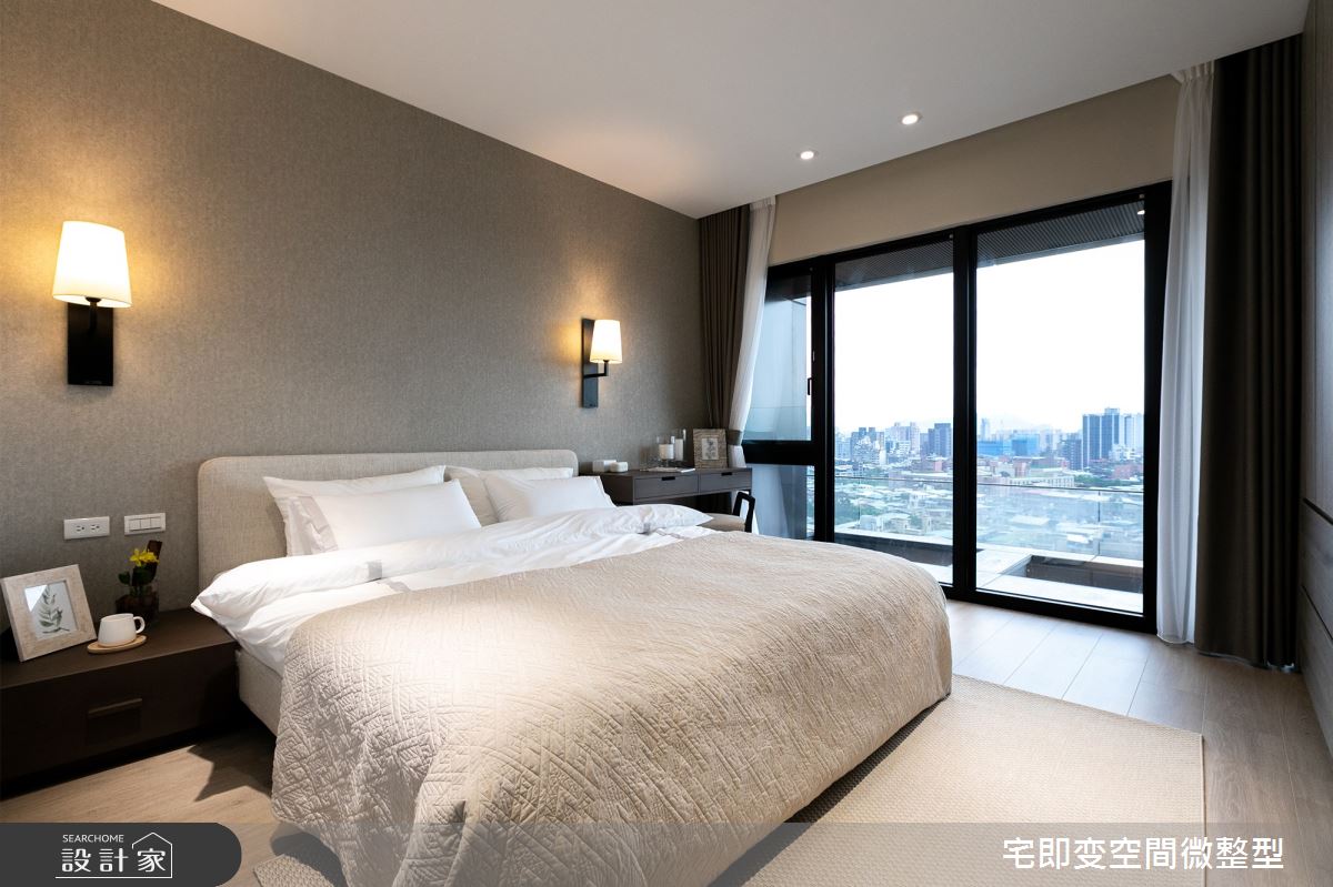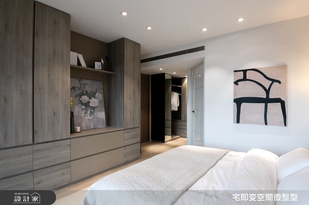 私領域延續暖光氛、米灰色調,傳遞一氣呵成的休閒氛圍,打造完美睡眠品質。主臥大面落地窗拉開房內空間尺度,迎來不輸大坪數的寬鬆視野;機能規劃上則客製化整面收納櫃,帶來大容量衣物收納空間,並透過創意格局切割巧思梳理順暢動線,將角落地帶化身小更衣間,完美發揮臥房坪效。